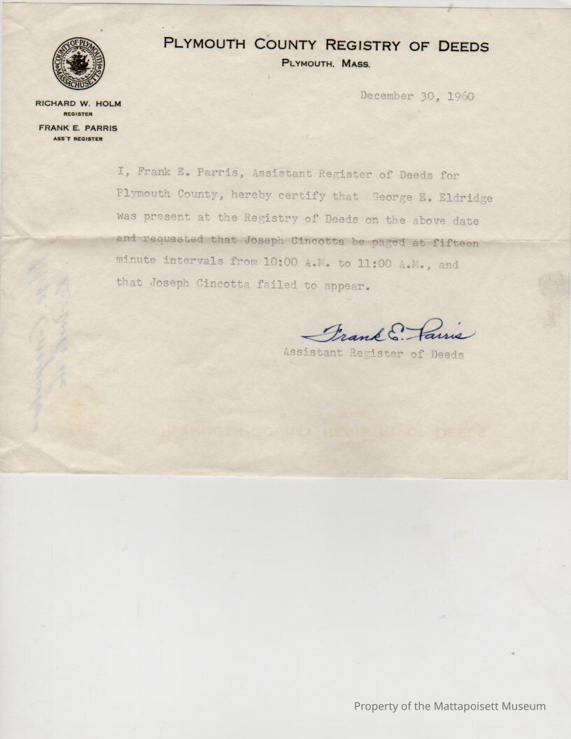 Certification by Frank E. Parris, Assistant Register of Deeds, Plymouth County, George E. Eldridge was present and requested that Joseph Cincotta be paged (failed to appear).Collection