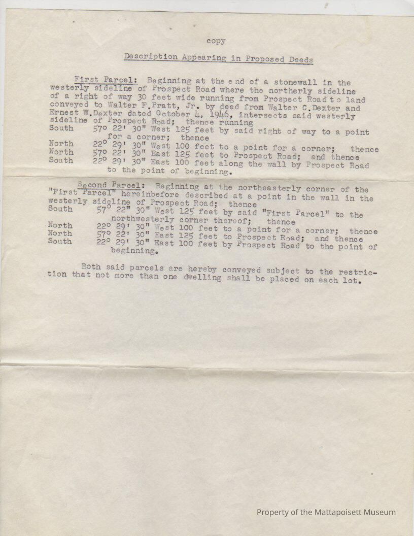 Description appearing in proposed deeds, of two parcels of land in Mattapoisett (copy), both conveyed subject to the restriction that not more than one dwelling shall be placed on each lot.Collection