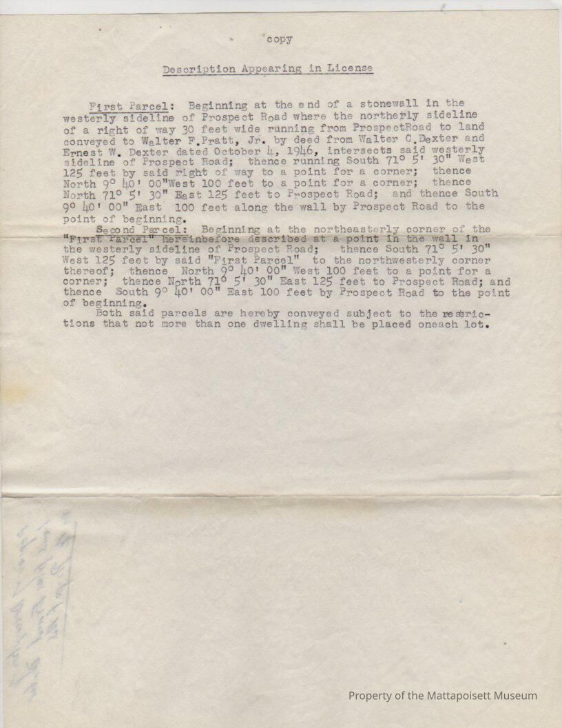 Description appearing in license, of two parcels of land in Mattapoisett (copy), both conveyed subject to the restriction that not more than one dwelling shall be placed on each lot.Collection