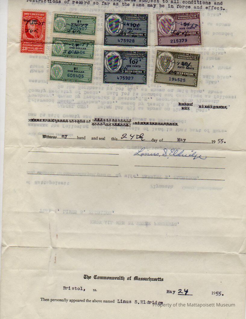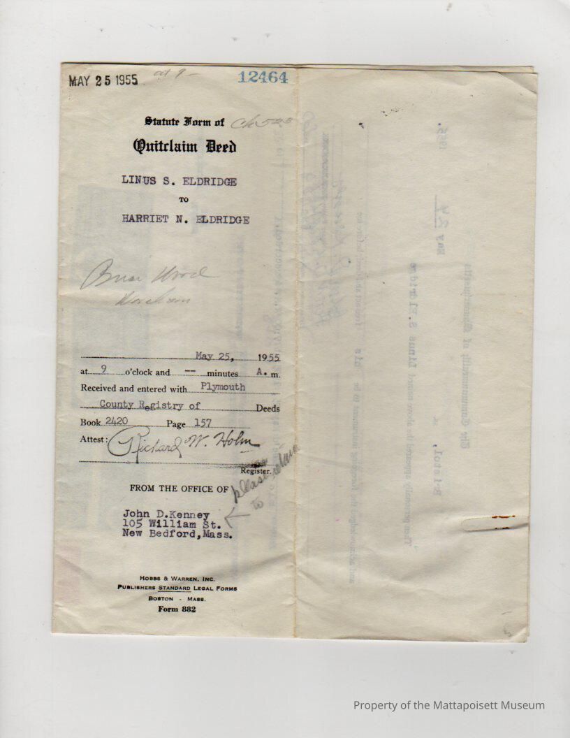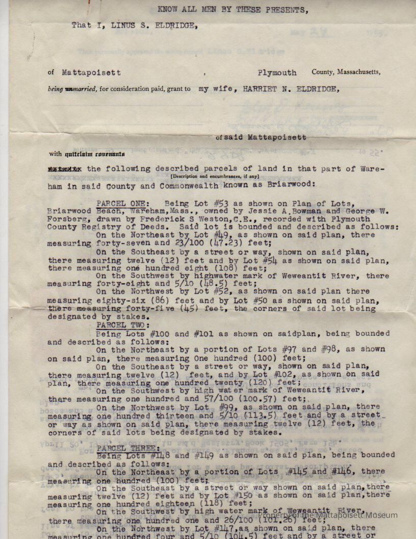 Quitclaim deed, Linus S. Eldridge to wife Harriet N. Eldridge, three parcels in Wareham, known as Briarwood. Recorded May 25, 1955, book 2420, page 157.Collection
