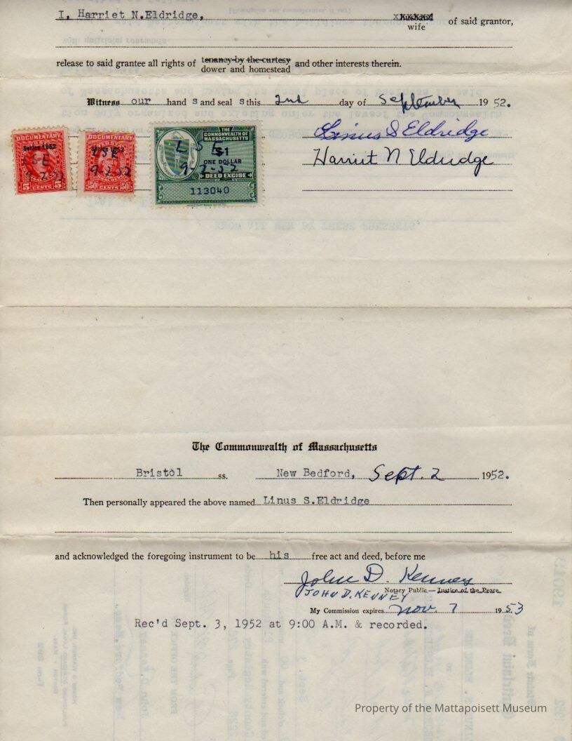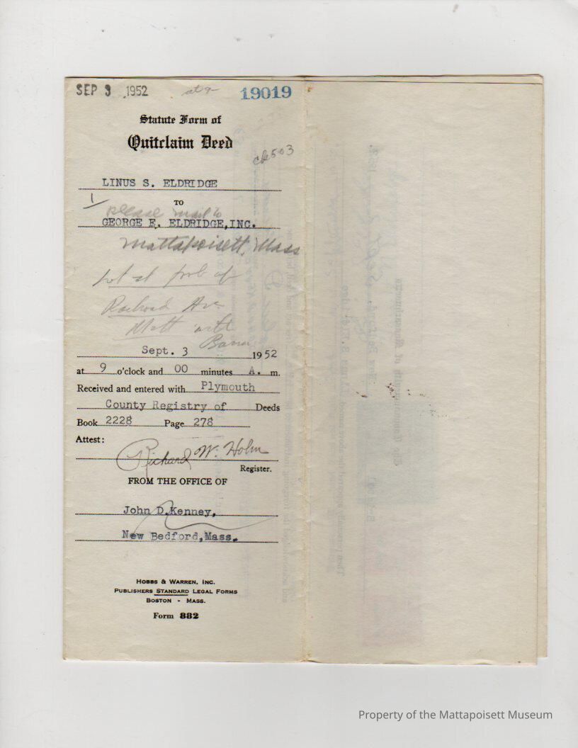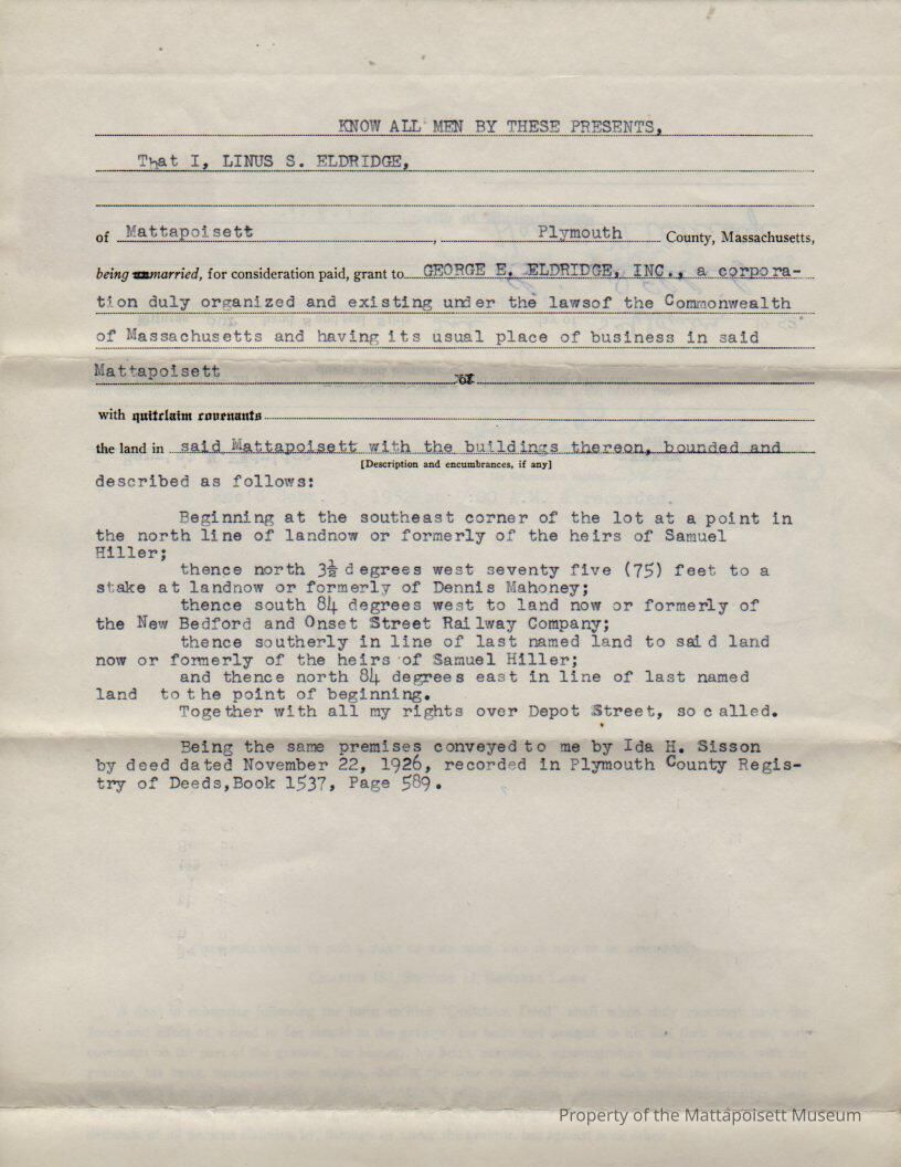 Quitclaim deed, Linus S. Eldridge and Harriet N. Eldridge to George E. Eldridge, Inc., land in Mattapoisett. Recorded November 22, 1926, book 1537, page 589Collection
