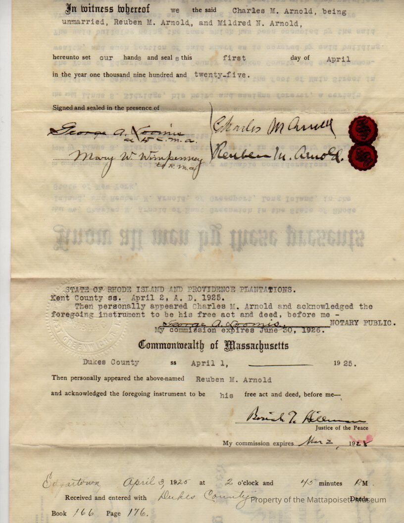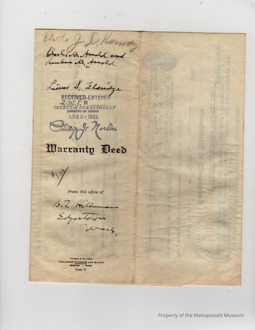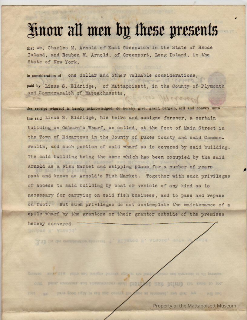 Deed, Charles M. Arnold and Reuben M. Arnold to Linus S. Eldridge of Mattapoiestt, for $1 and other valuable considerations a building on Oborn's Wharf, at the foot of Main Street in Edgartown, as Arnold's Fish Market and shipping place. Recorded in Duke's County, April 3, 1925, book 166, page 176.Collection