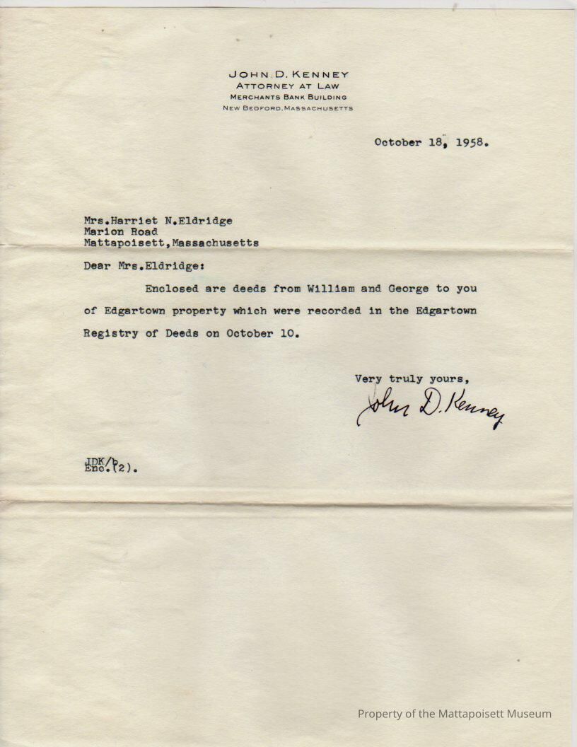 Letter to Harriet N. Eldridge from John D. Kenney, attorney, with enclosed deeds from William and George to you of Edgartown property.Collection