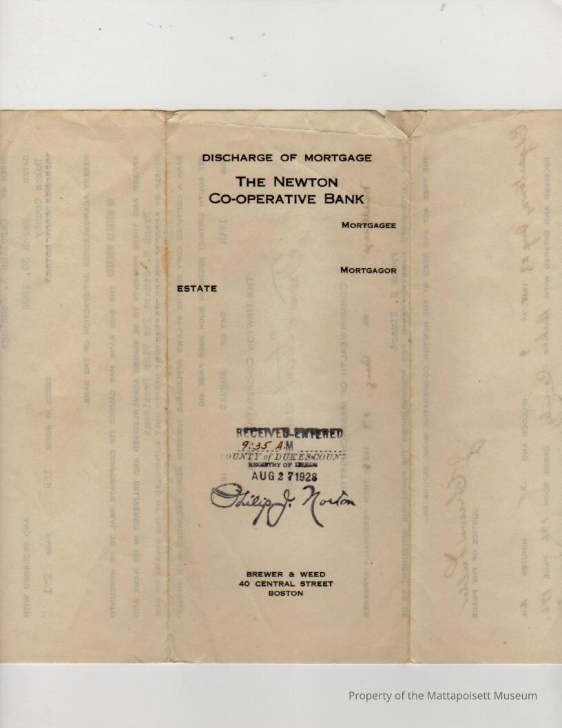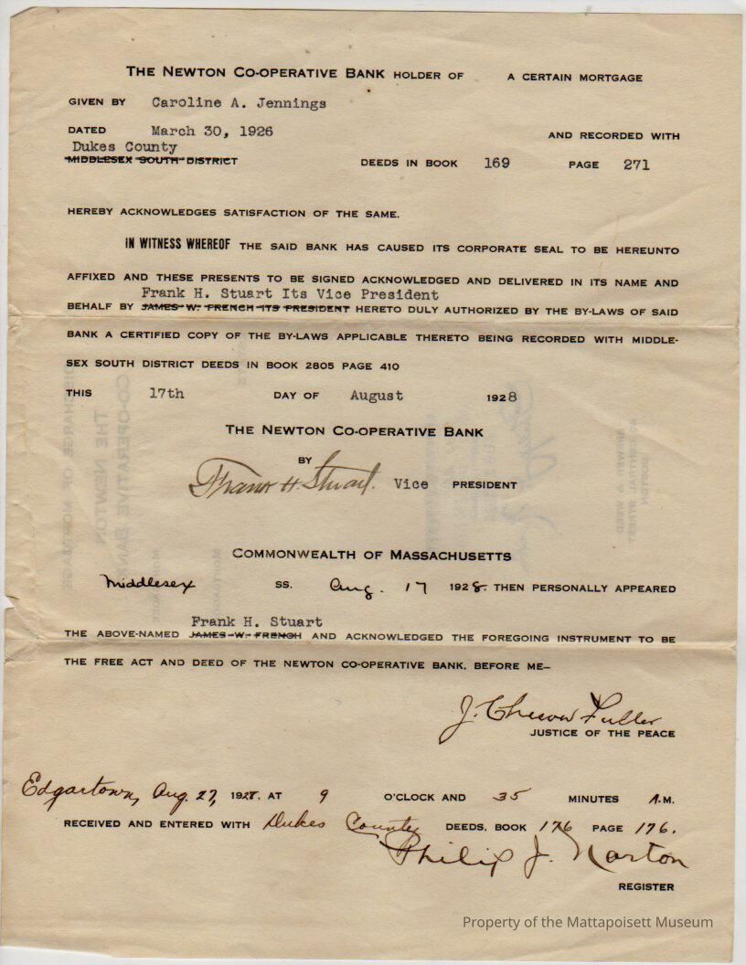 Discharge of Mortgage given by Caroline A. Jennings, dated March 30, 1926, recorded book 169, page 271. Recorded, Edgartown, August 27, 1928, book 176, page 176.Collection