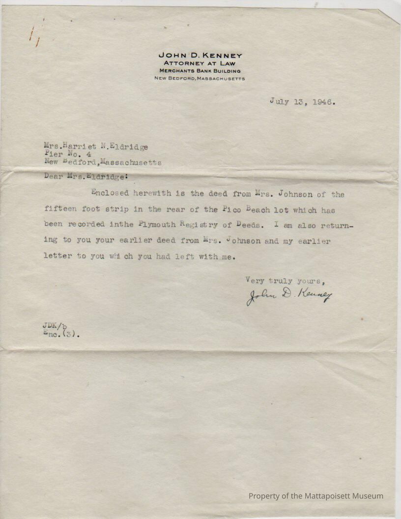 Letter to Harriet N. Eldridge from John D. Kenney, attorney, enclosed deed from Mrs. Johnson of the 15-foot strip in the rear of Pico Beach lot.Collection