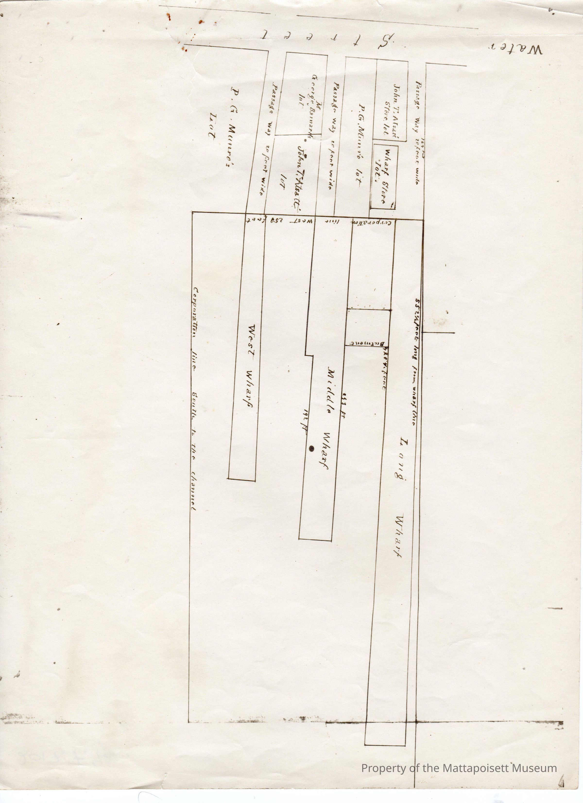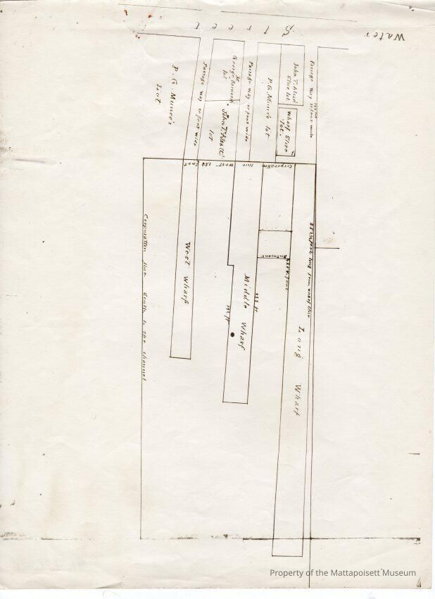Plan of the Mattapoisett town wharves, showing Long Wharf, Middle Wharf, West Wharf, and some plots along Water St.Acquisition