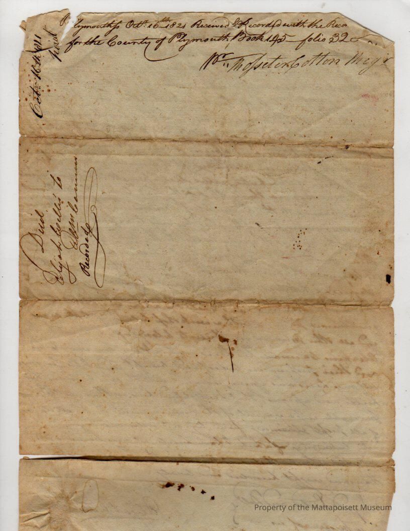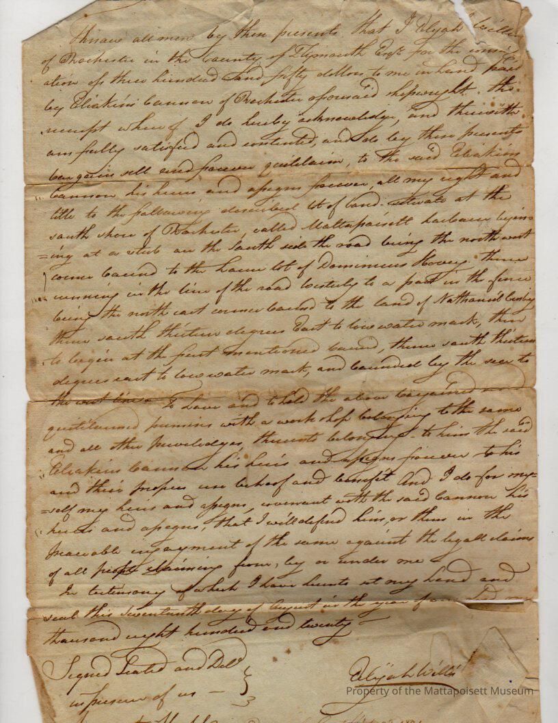 Deed, Elisha Willis to Eliakim Cannon, 1820. $350, land in village of Mattapoisett. 10/16/1821, book 145, folio 32.Collection