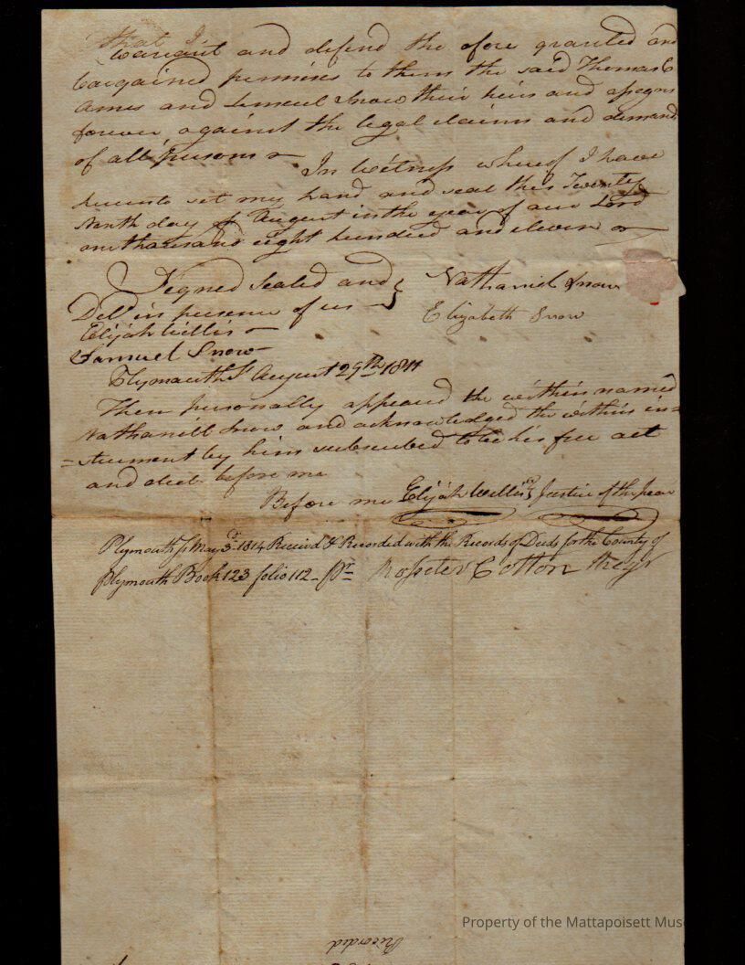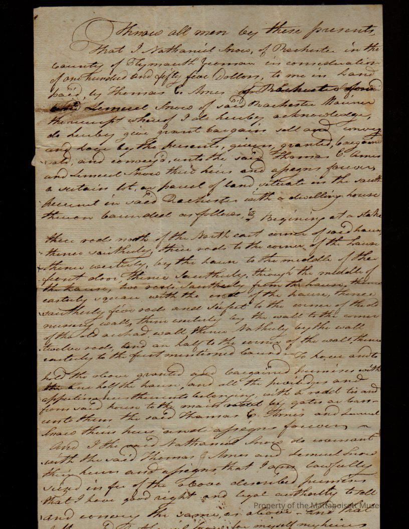 Deed, Nathaniel Snow to Thomas C. Ames. $155, land in the south of Rochester.Collection