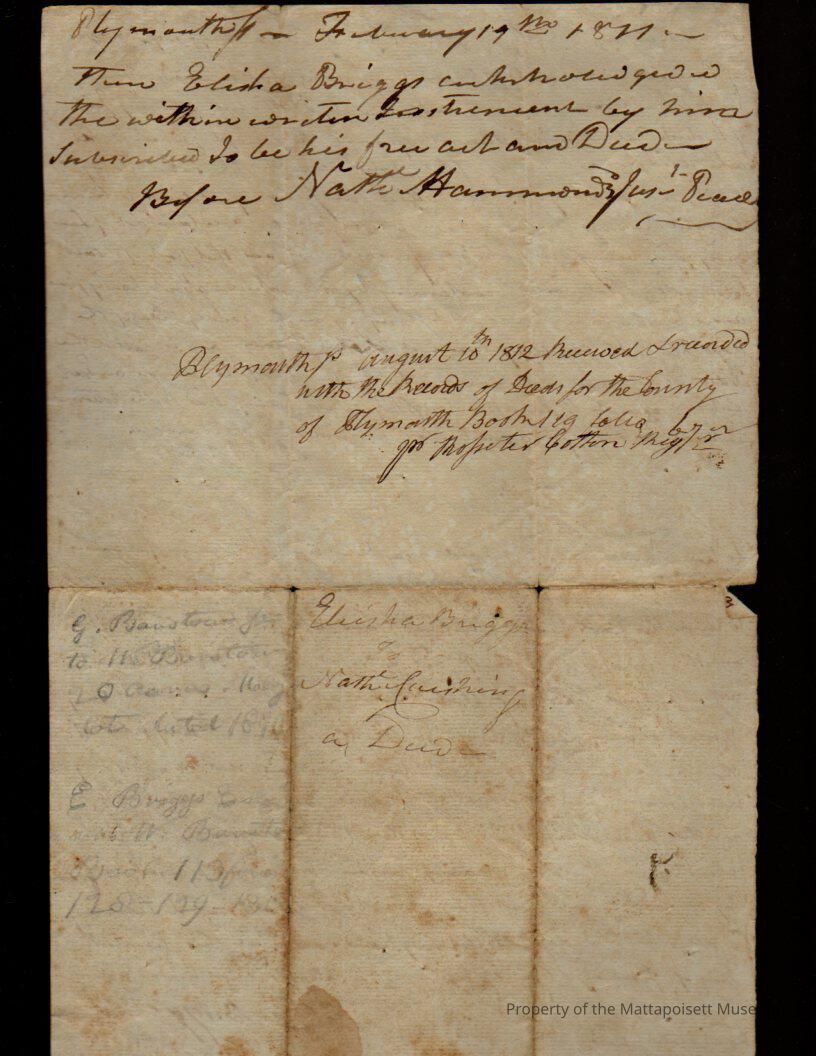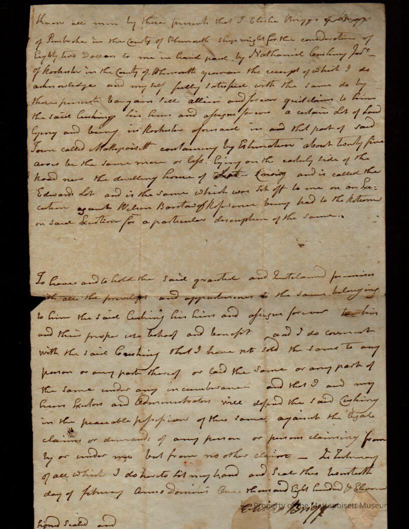 Deed, Elisha Briggs to Nathaniel Cushing. $82, lot in part of Rochester called Mattapoisett.Collection
