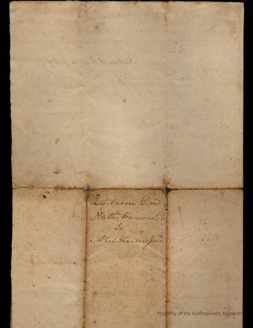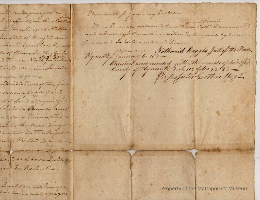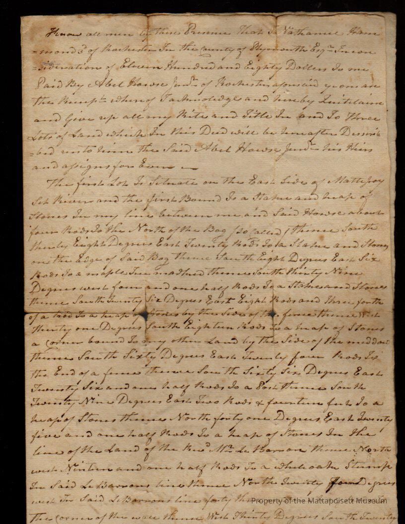 Deed, Nathaniel Hammond to Abel House. $1,180, lot on east side of Mattepoyset River.Collection