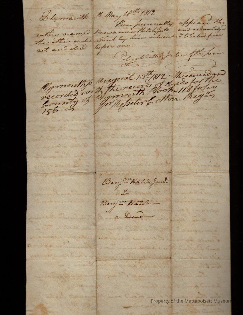 Deed, Benjamin Hatch Jr. to Benjamin Hatch. $280, land in the south precinct of Rochester.Collection