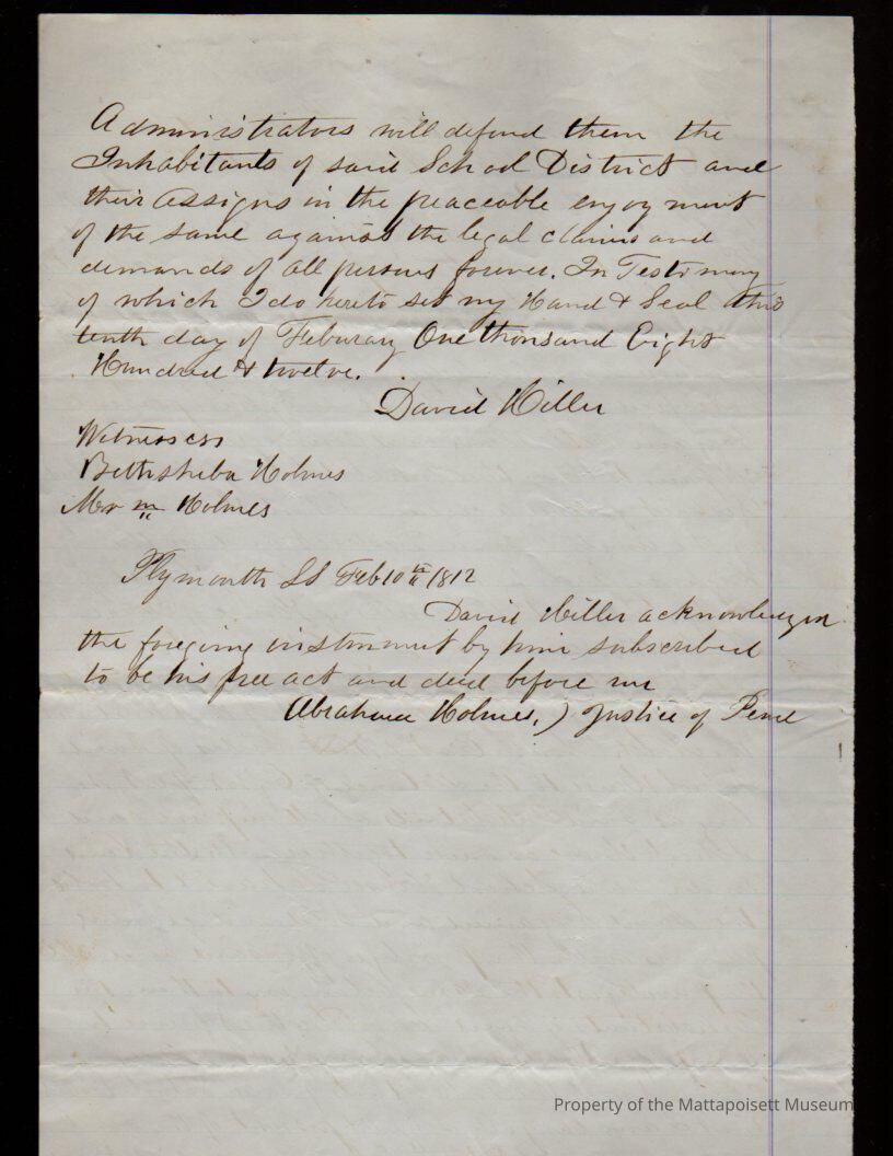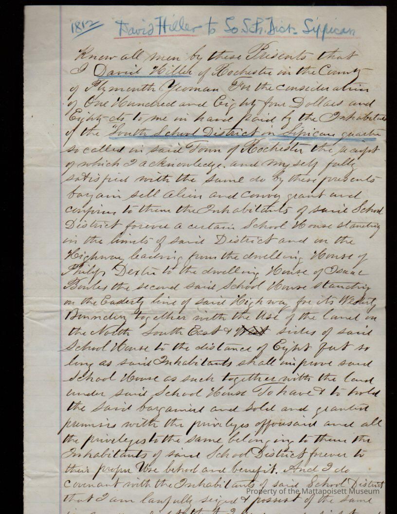 Deed, David Hiller to South School District, Sippican. $180, for school house.Collection