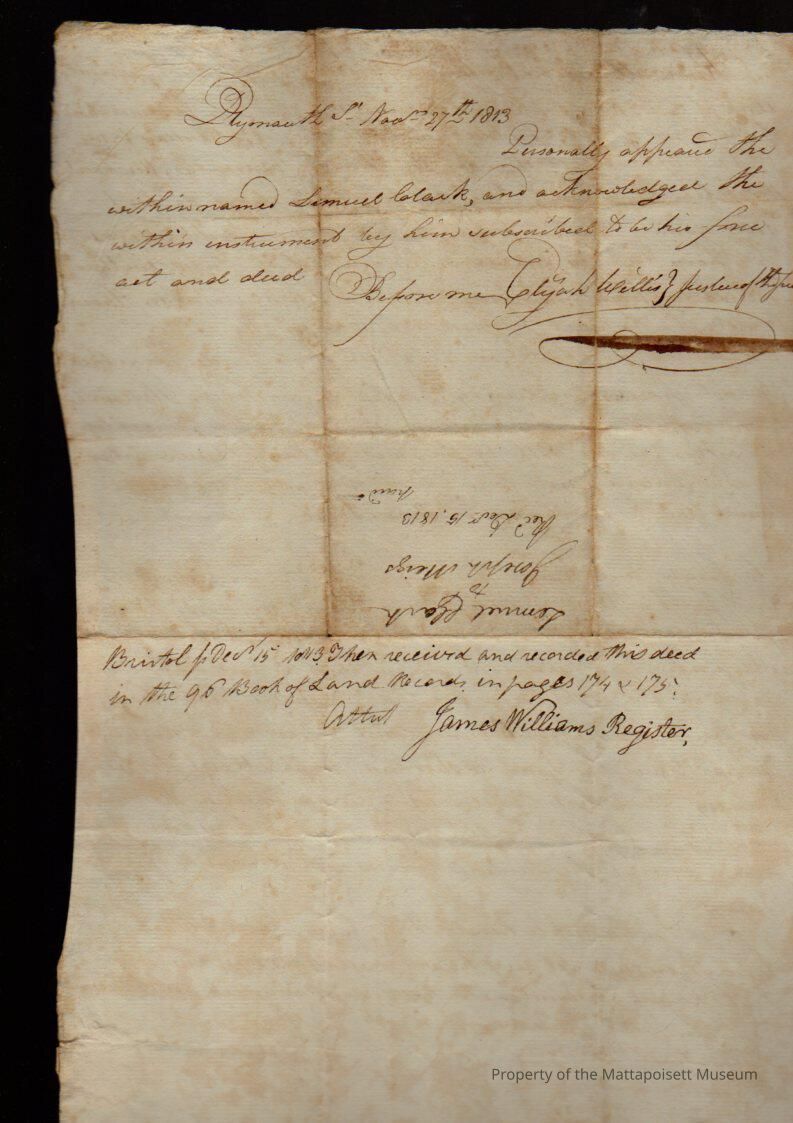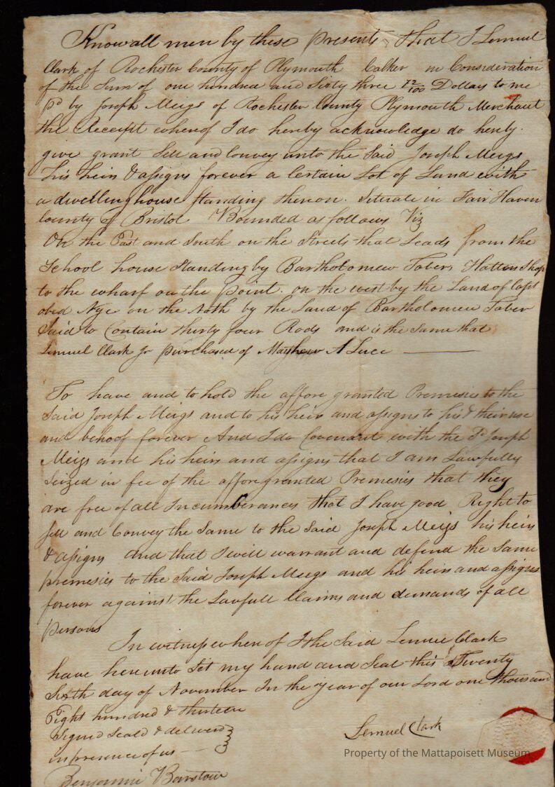 Deed, Lemuel Clark to Joseph Meigs. Lot of land and dwelling house in Fairhaven for $163.72. Book 96, pages 174-175.Collection