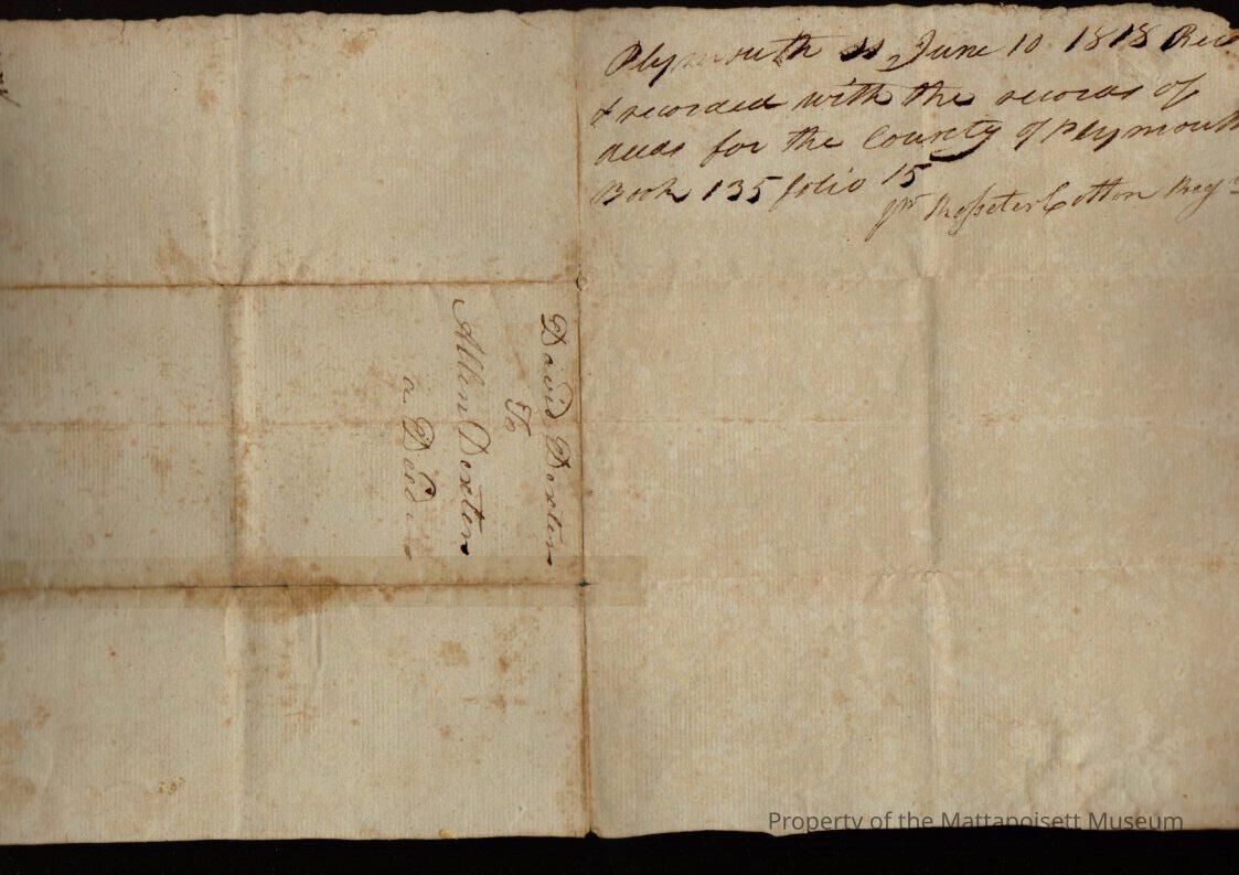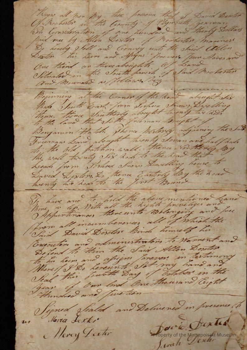 Deed, David and Sarah Dexter to Allen Dexter. Lot in south part of Rochester for $130, book 135, folio 15.Collection