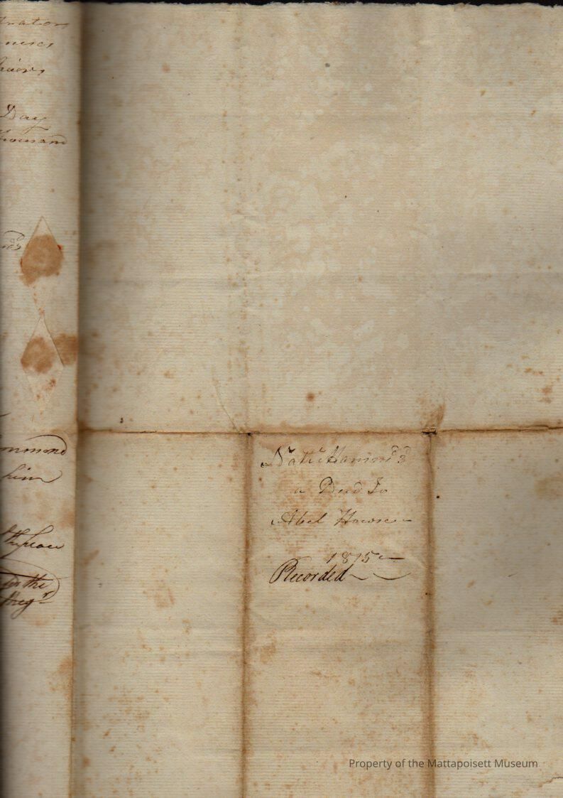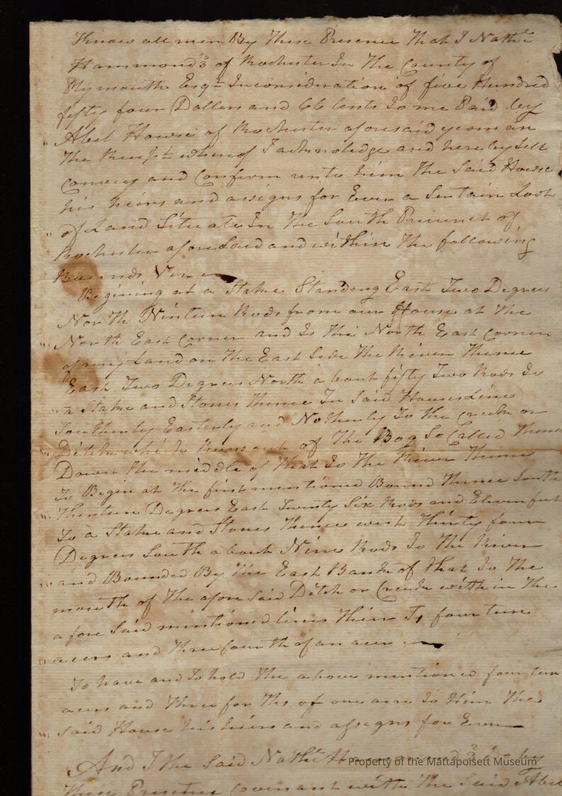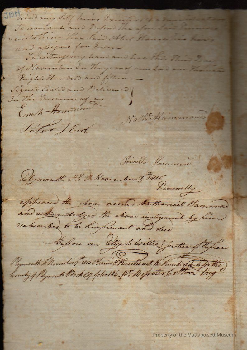 Deed, Nathaniel and Pricilla Hammond to Abel House. Lot in south precinct in Rochester for $554.66, book 1227, folio 186.Collection