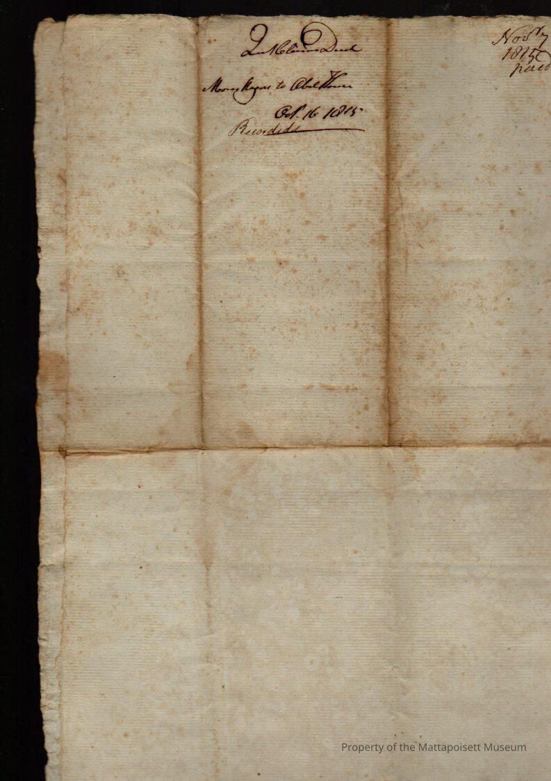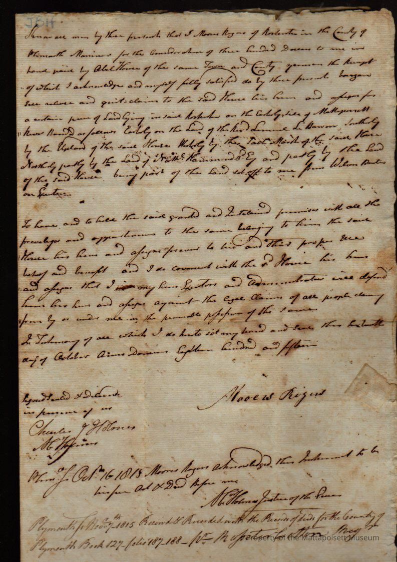 Deed, Moores Rogers to Abel House. Land on easterly side of Mattapoisett River for $300, book 127, folio 187-188.Collection