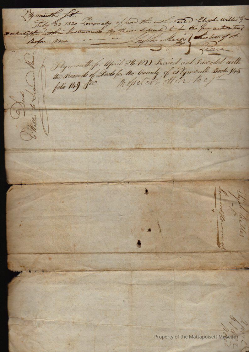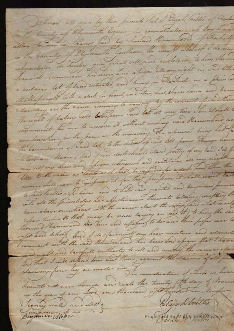 Deed, Elijah Willis to Leonard Hammond. Land in Mattapoisett villiage, with a dock in front, buildings for $1,000, book 145, folio 149.Collection