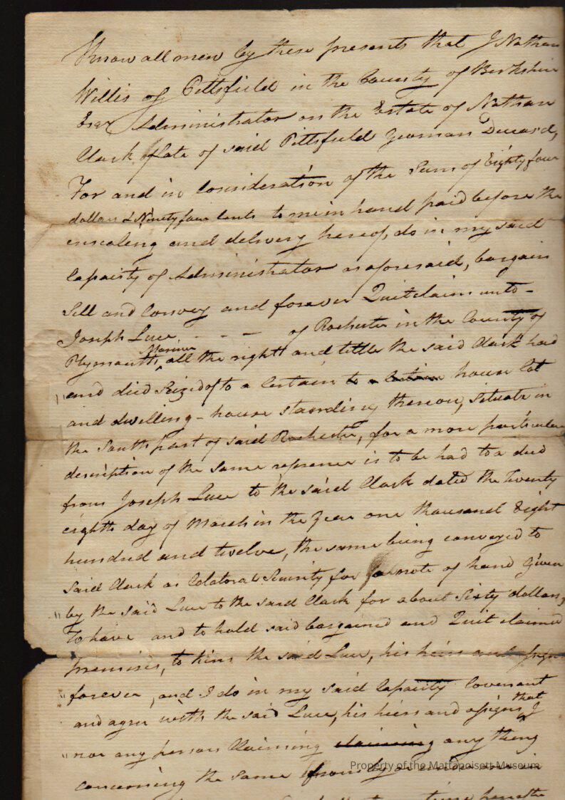 Deed, Nathan Willis, administrator to Nathan Clark to John Luce, $84.94, book 147, folio 22.Collection