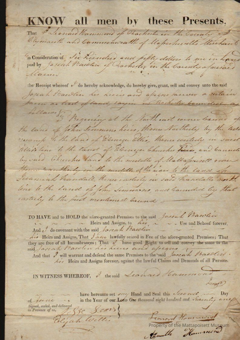 Deed, Leonard (and wife) Hammond to Josiah Bowlin, $650, book 143, folio 137.Collection