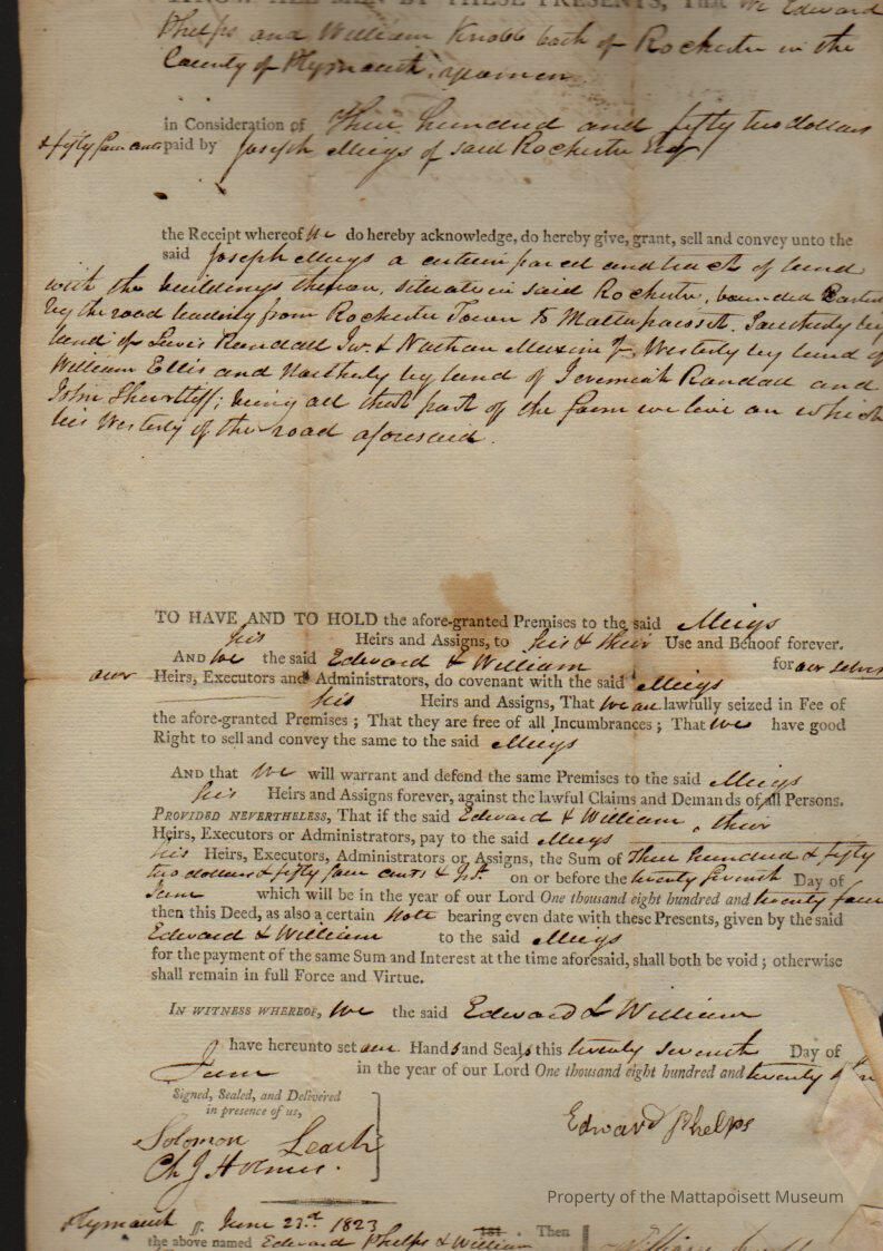 Deed, Edward Phelps & William Knoble to Joseph Meigs, $350, book 149, folio 158.Collection