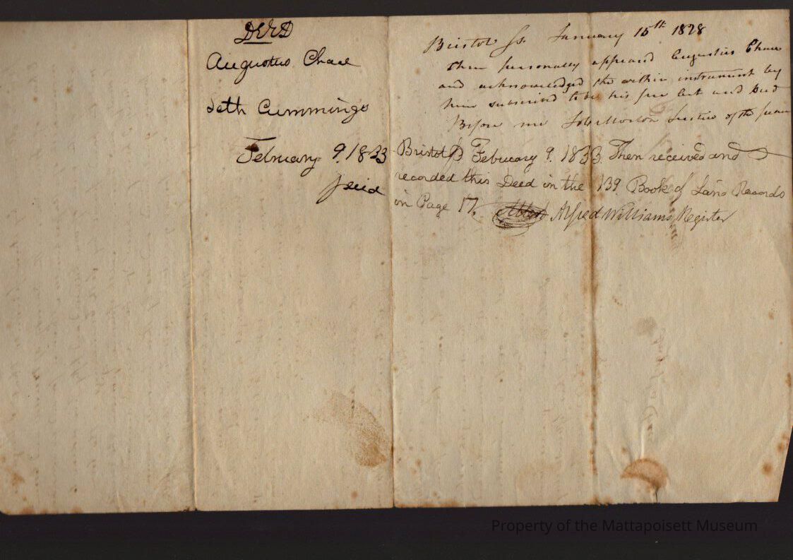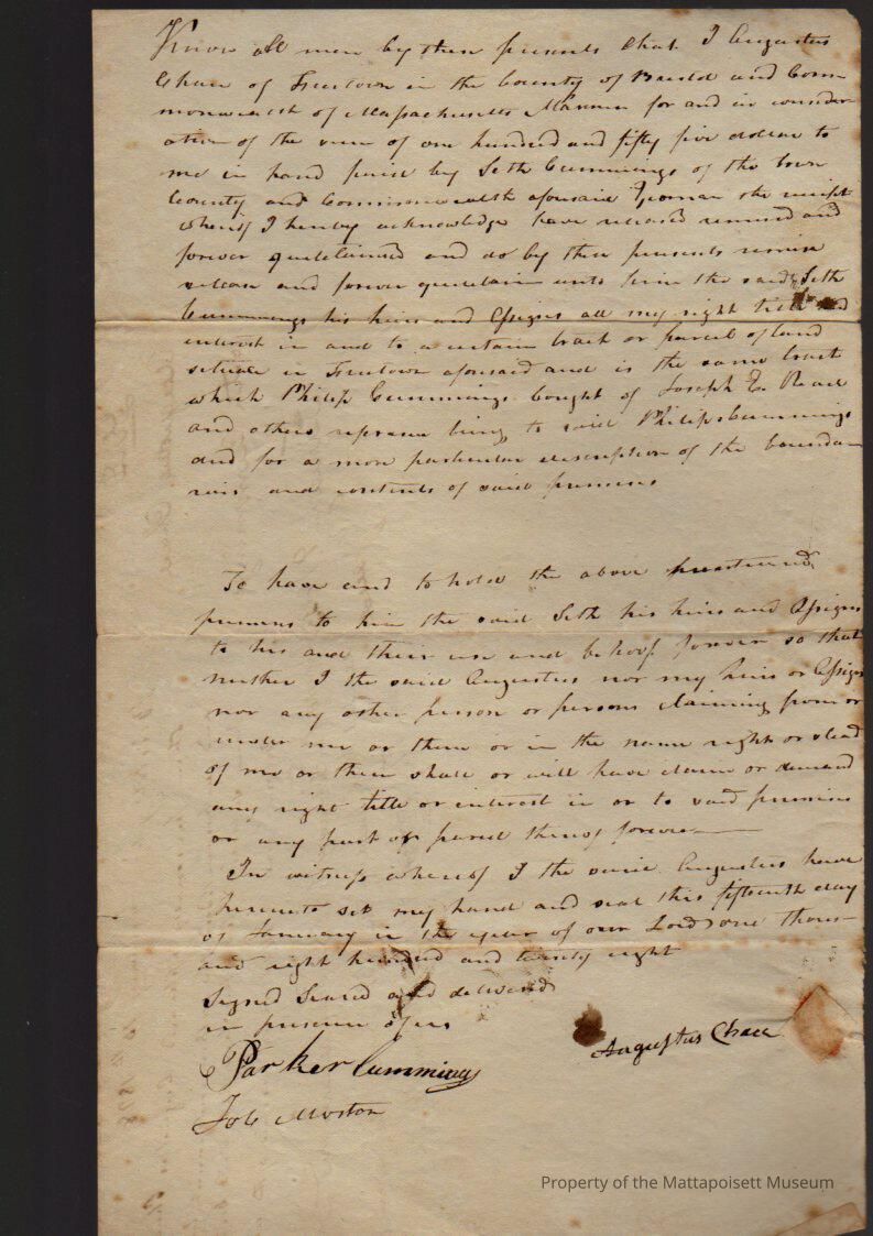 Deed, Augustus Chace (of Tiverton) to Seth Cummings, $155, book 139, page 17.Collection