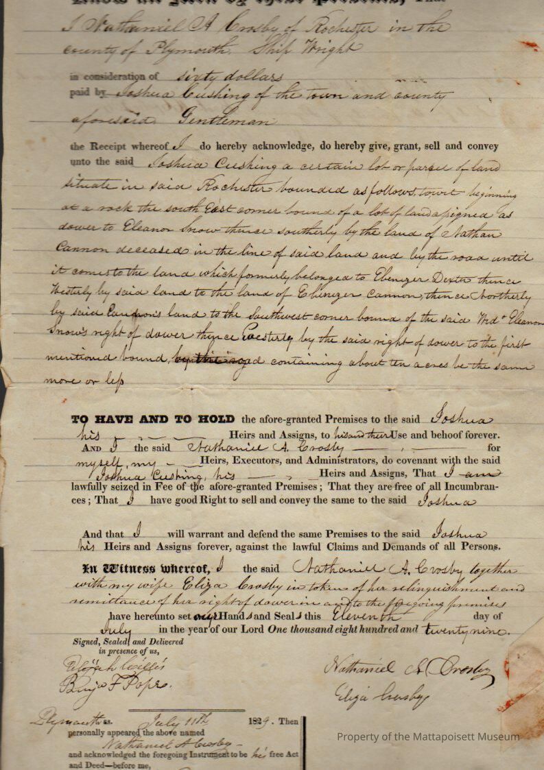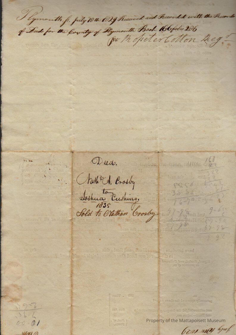 Deed, Nathaniel & Eliza Crosby to Joshua Cushing, $60, book 166, folio 286.Collection