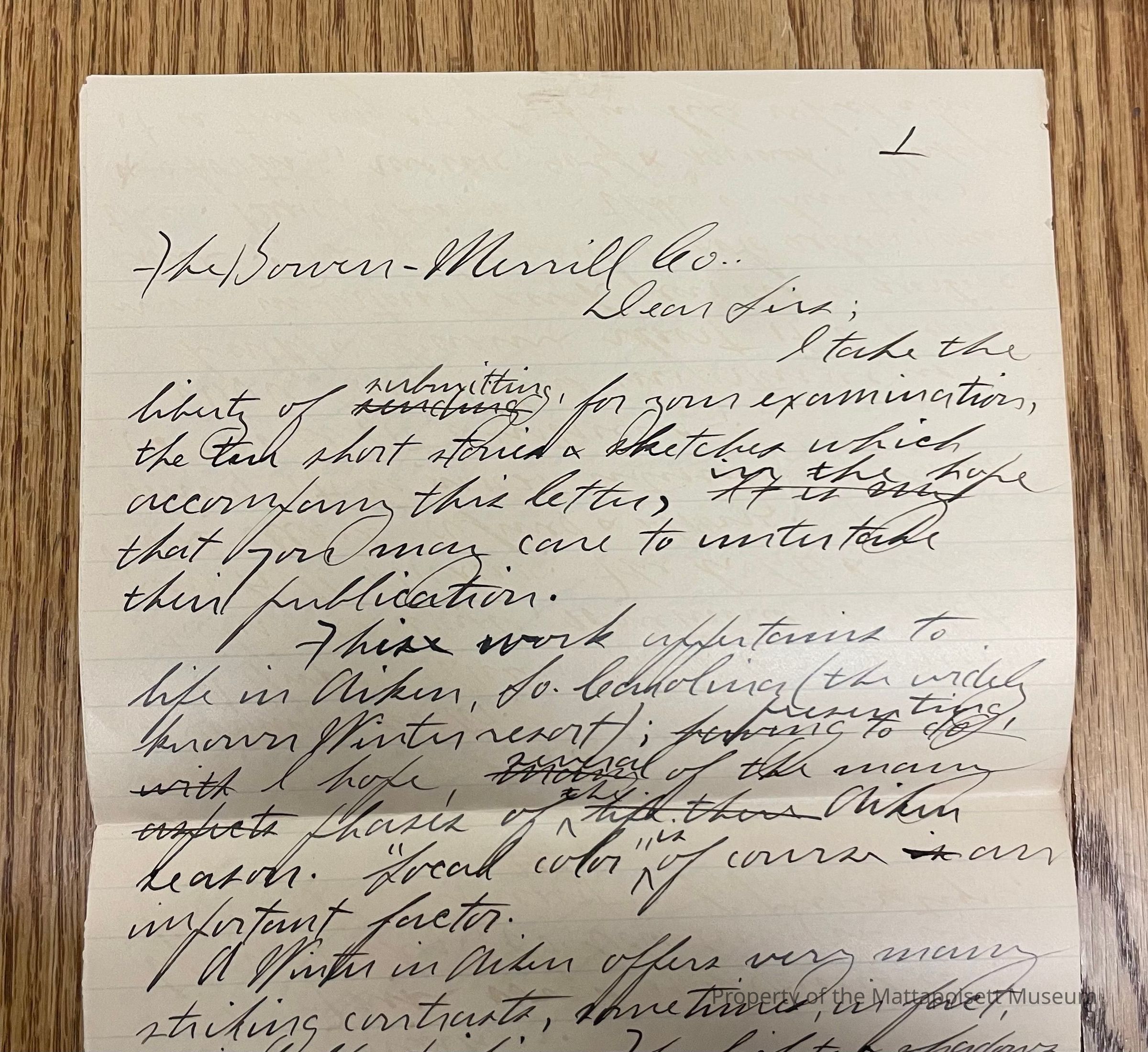 Harrington wrote to Bowen-Merrill Company to ask if they would publish his manuscript. He writes about his experience spending winter in Aiken, South Carolina.Subject Person/Organization
