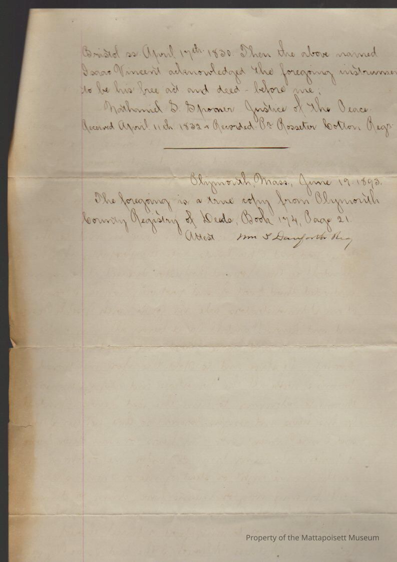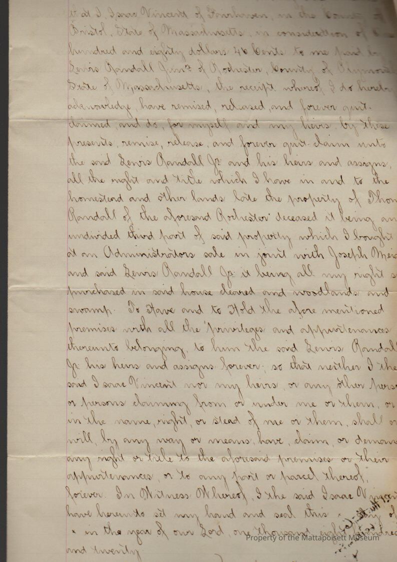 Copy of deed, Isaac Vincent of Fairhaven to Lewis Randall (copy), $180.46, book 174, folio 21.Collection