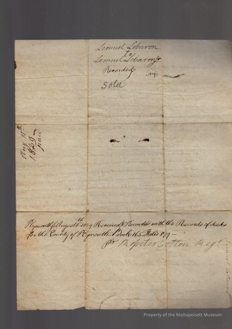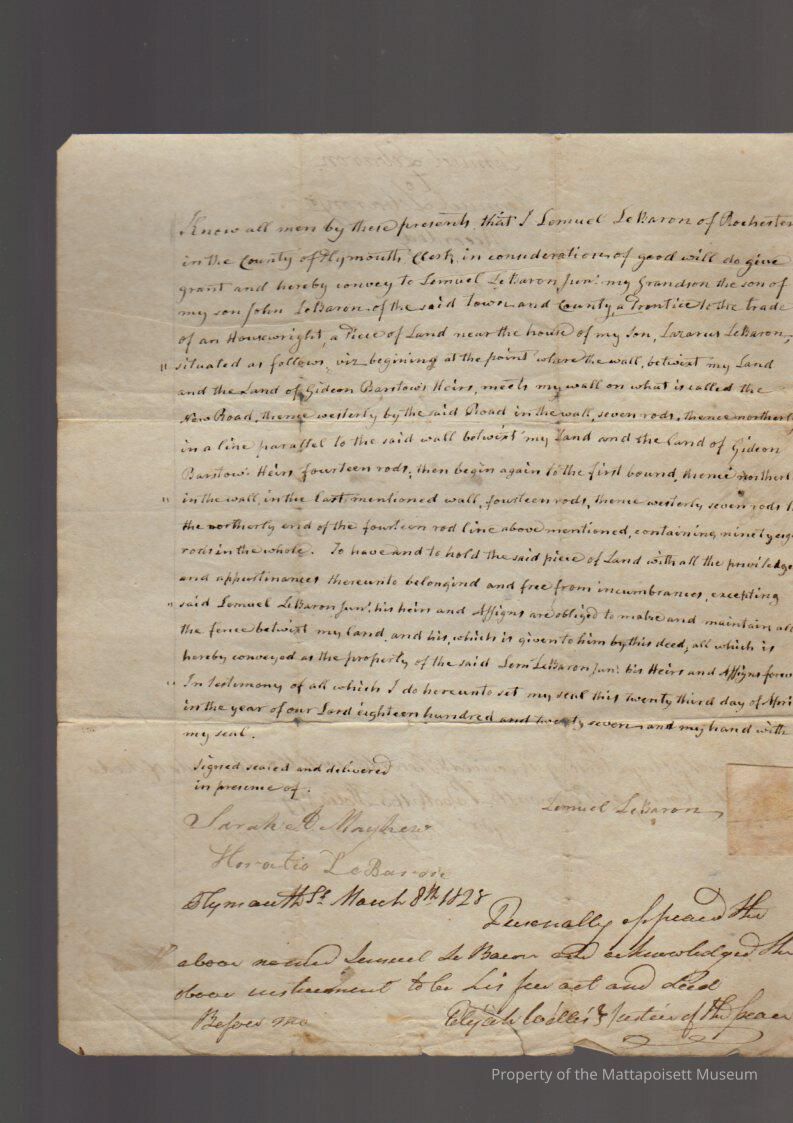 Lemuel LeBaron to grandson, Lemuel LeBaron Jr., son of John LeBaron for the consideration of good will, book 165, folio 879.Collection