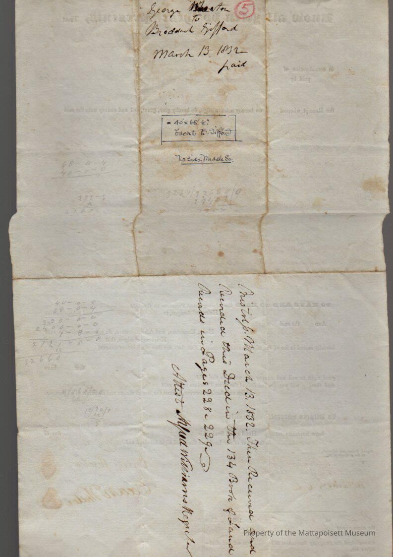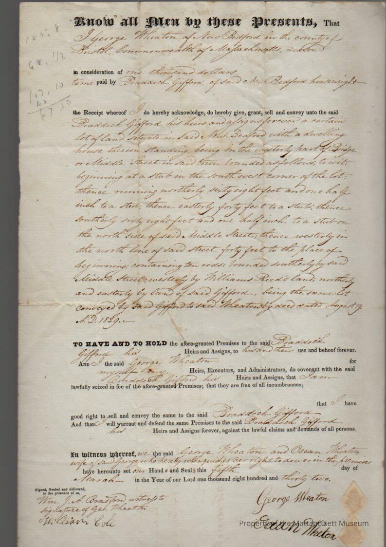 George & Ocean Wheaton to Braddock Gifford, lot of land and dwelling house in New Bedford on the westerly part of Bridge or Middle Street for $1,000, book 134, folio 228-229.Collection