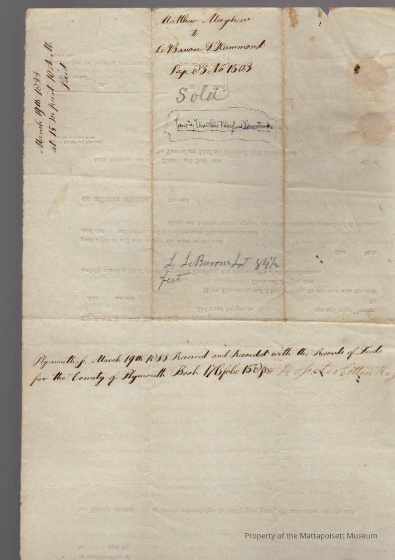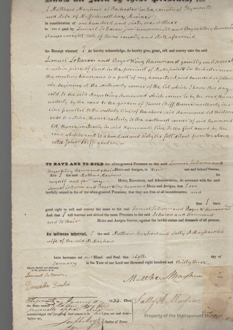 Matthew & Sally A. Mayhew to Lemuel LeBaron & Roger Wing Hammond, for $166, book 176, folio 158.Collection