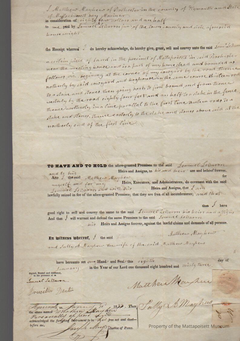 Matthew & Sally A. Mayhew to Lemuel LeBaron, for $84.50, book 176, folio 156.Collection