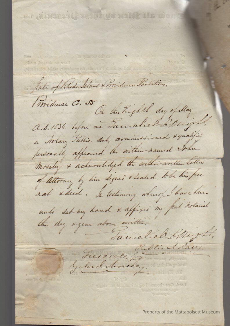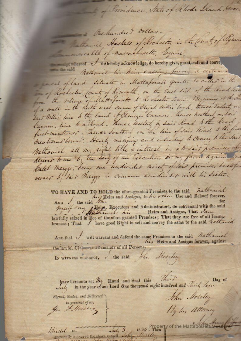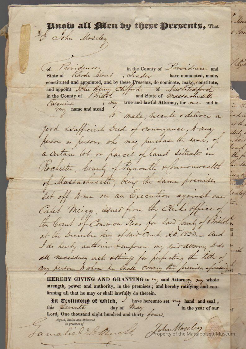 John Mosley of Providence (trader), appoints John Henry Clifford to make deed as Power of Attorney to Nathaniel Haskell. Original deed July 3, 1834, book 178, folio 261-262.Collection