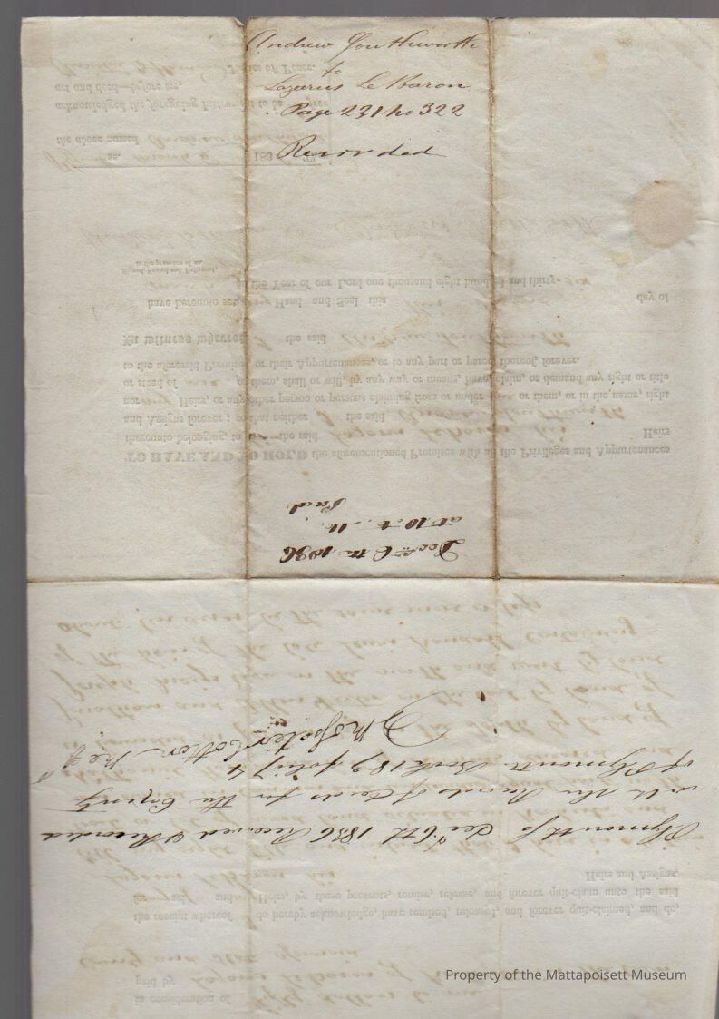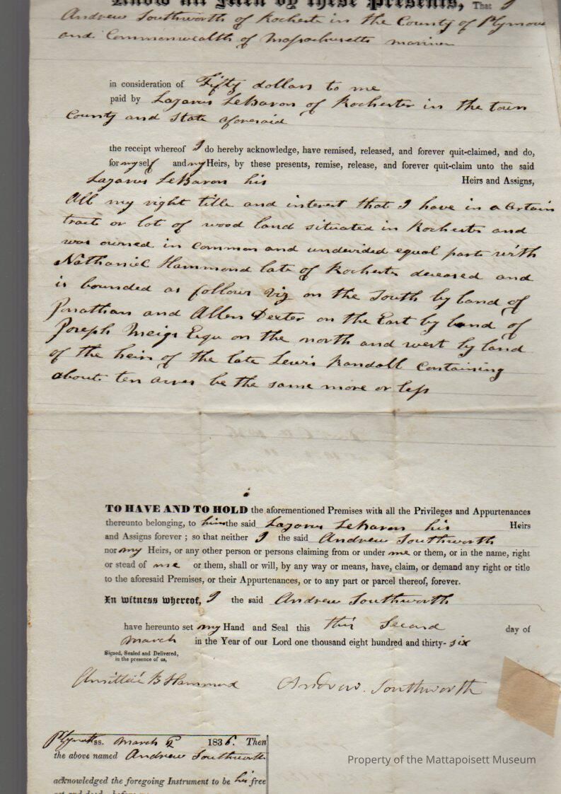 Andrew Southworth to Lazerus LeBaron, wood lot owned in common with the late Nathaniel Hammond for $50, book 187, folio 74.Collection