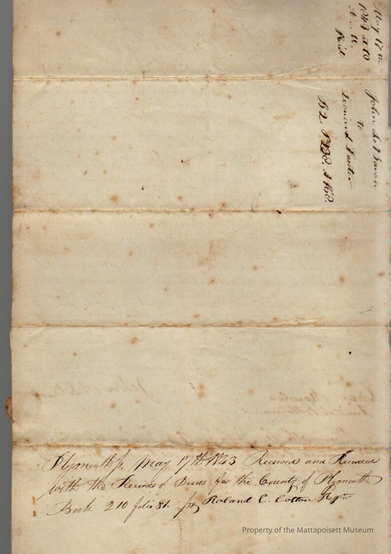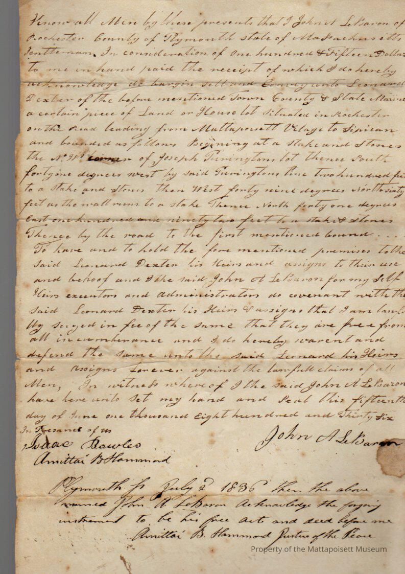 John A. LeBaron to Leonard Dexter, house lot, Mattapoisett to Sippican for $115, book 210, folio 81.Collection