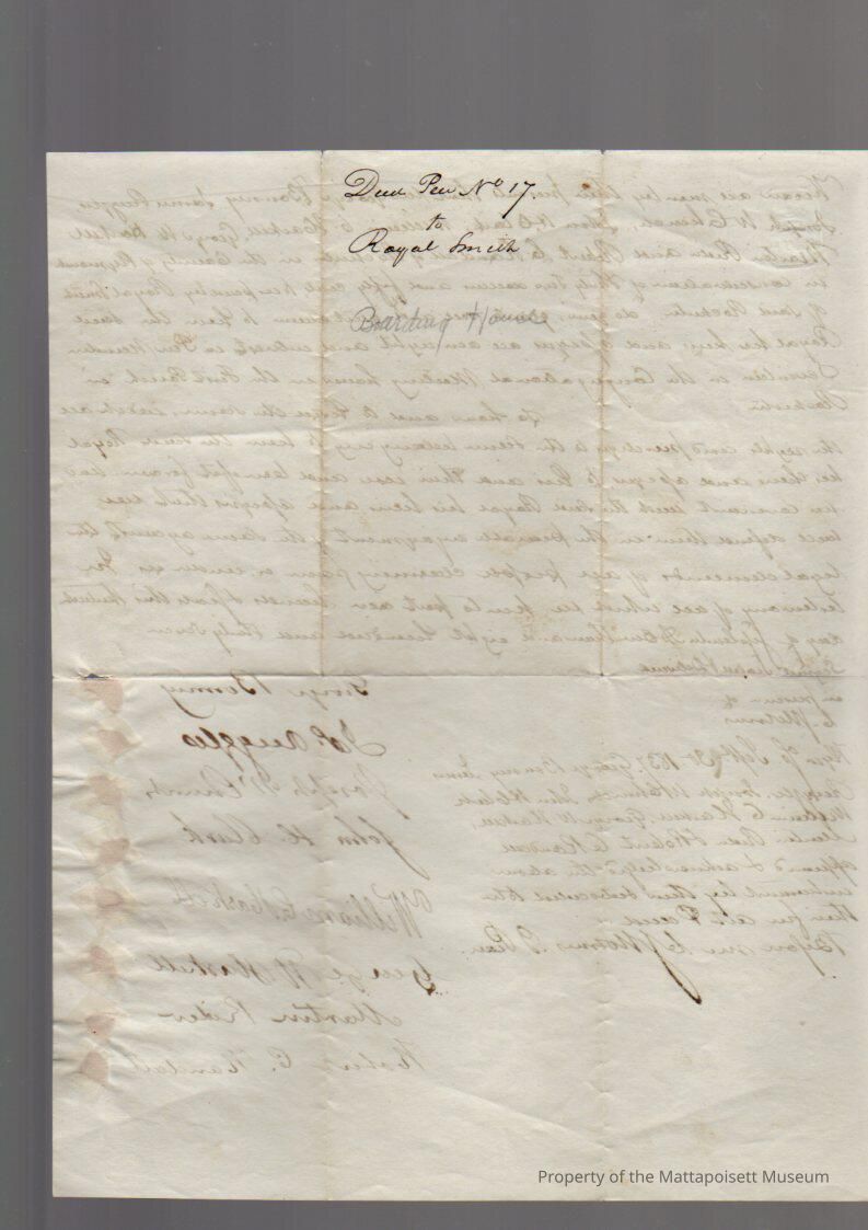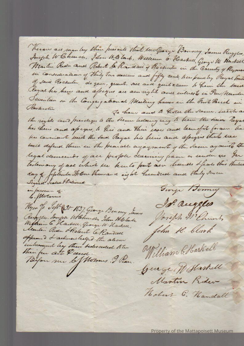 George Bonney, et al (James Ruggles, John H. Clark, George W. Haskell, Robert C. Randall, Joseph W. Church, William G. Haskell, Martin [Rider]) to Royal Smith, Pew #17 in Congregational Meeting House for $32.50.Collection