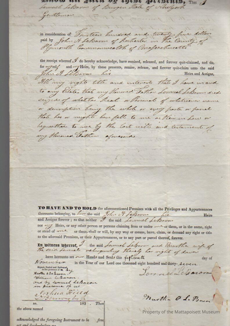 Lemuel & Martha P. LeBaron to John A. LeBaron, for $1,425, book 196, folio 61.Collection