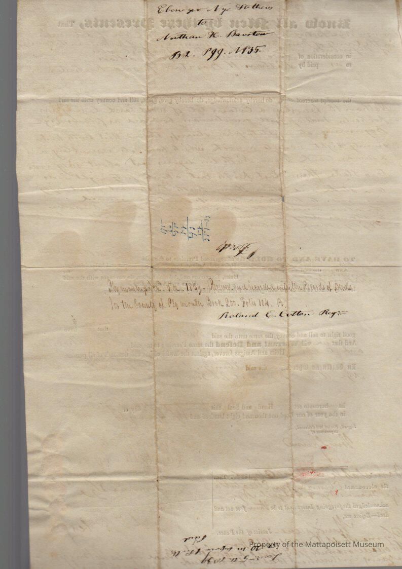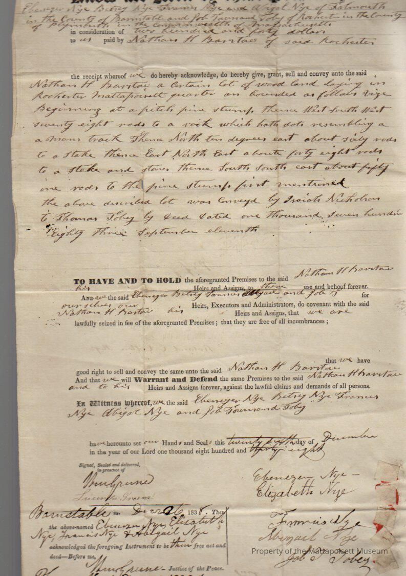 Ebenezer & Betsy Nye, et al (Francis & Abigail Nye and Job T. Tobey) to Nathan H. Barstow, for $240, book 200, folio 104.Collection