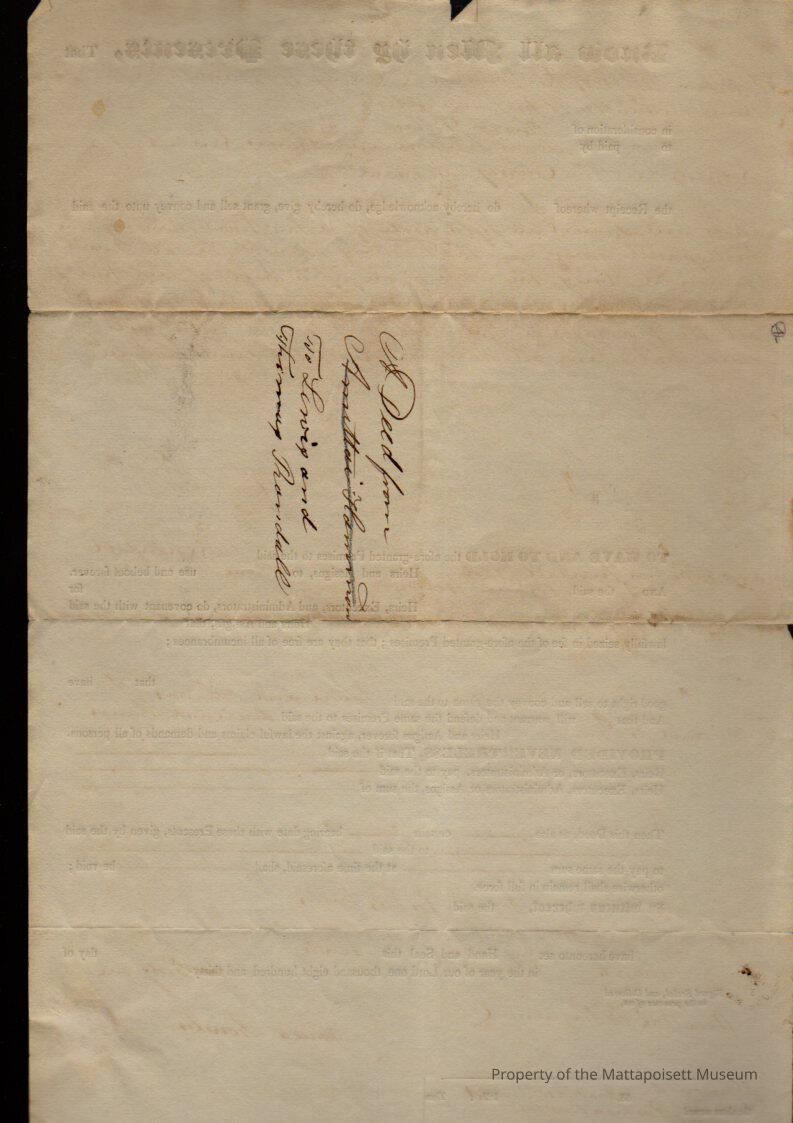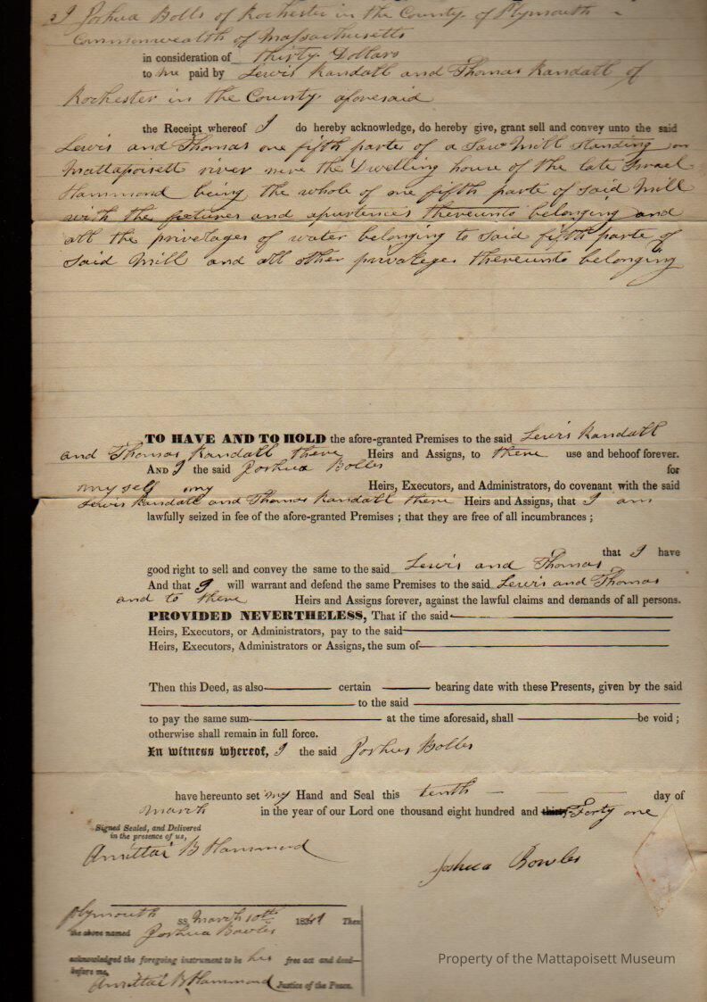 Joshua Bolles to Lewis Randall & Thomas Randall, 1/5 part in saw mill on Mattapoisett River for $30. see .223Collection