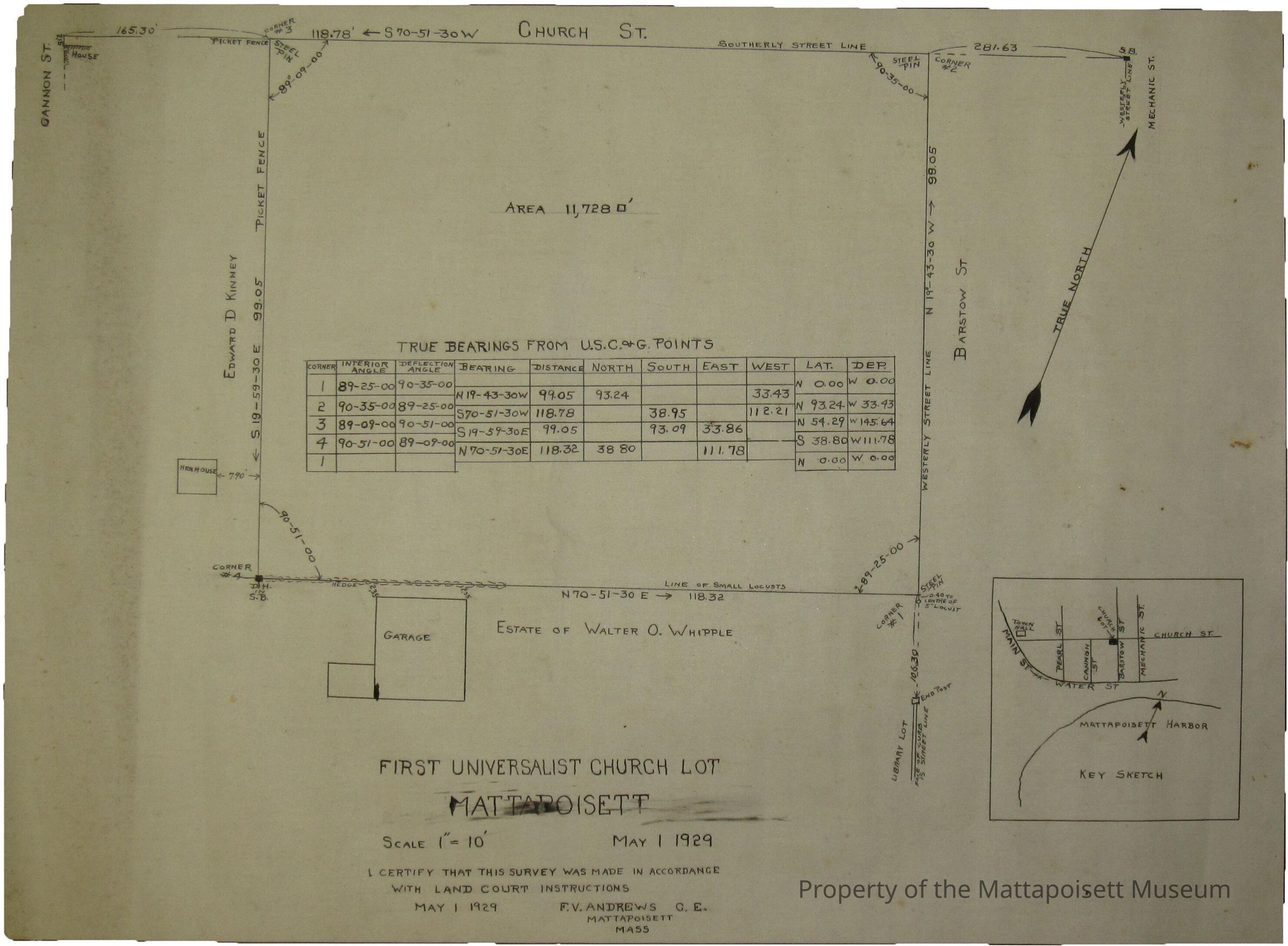 First Universalist Church Lot, Mattapoisett, Mass. Scale 1"=10'. May 1, 1929. I certify that this survey was made in accordance with land court instructions, May 1, 1929. F. V. Andrews, C. E. Mattapoisett, Mass.Acquisition