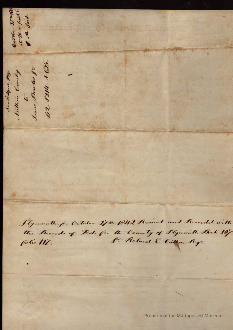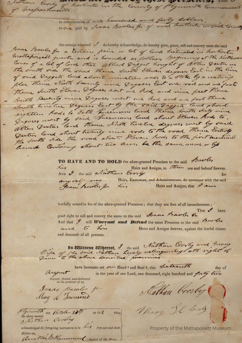 Nathan & Mary H. Crosby to Isaac Bowles Jr., land in Mattapoisett quarter for $140, book 207, folio 117.Collection