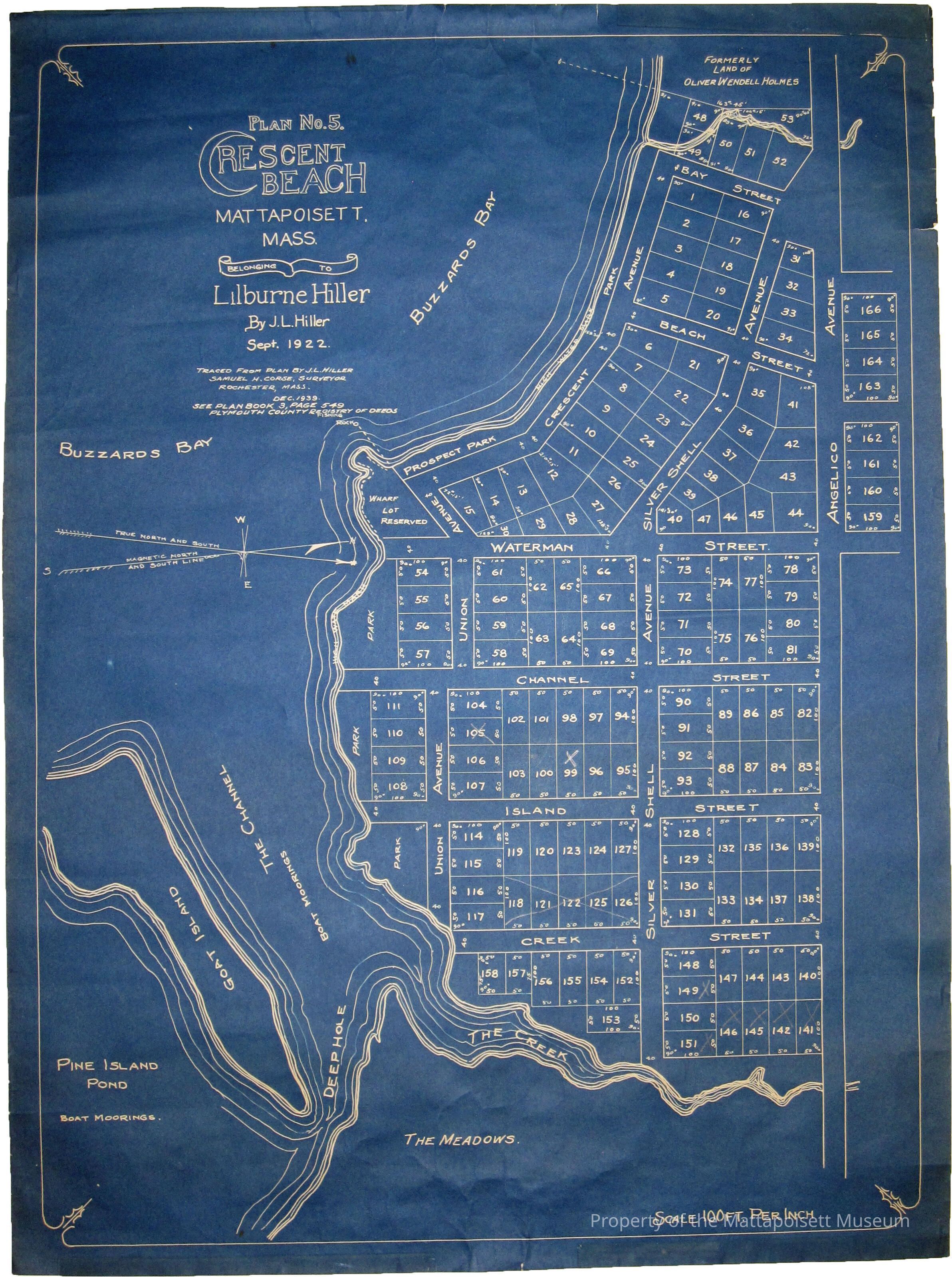 Plan No. 5. Crescent Beach, Mattapoisett, Mass. Belonging to Lilburne Hiller, by J. L. Hiller, September 1922. Traced from plan by J. L. Hiller Samuel H. Corse, surveyor, Rochester, Mass. December 1939. See plan book 3, page 549, Plymouth County Registry of Deeds. Waterman, Beach, Channel, Island, Creek Streets, Silver Shell , Angelico and Union Avenues. On Buzzard's Bay. Scale 100ft per inch.Collection
