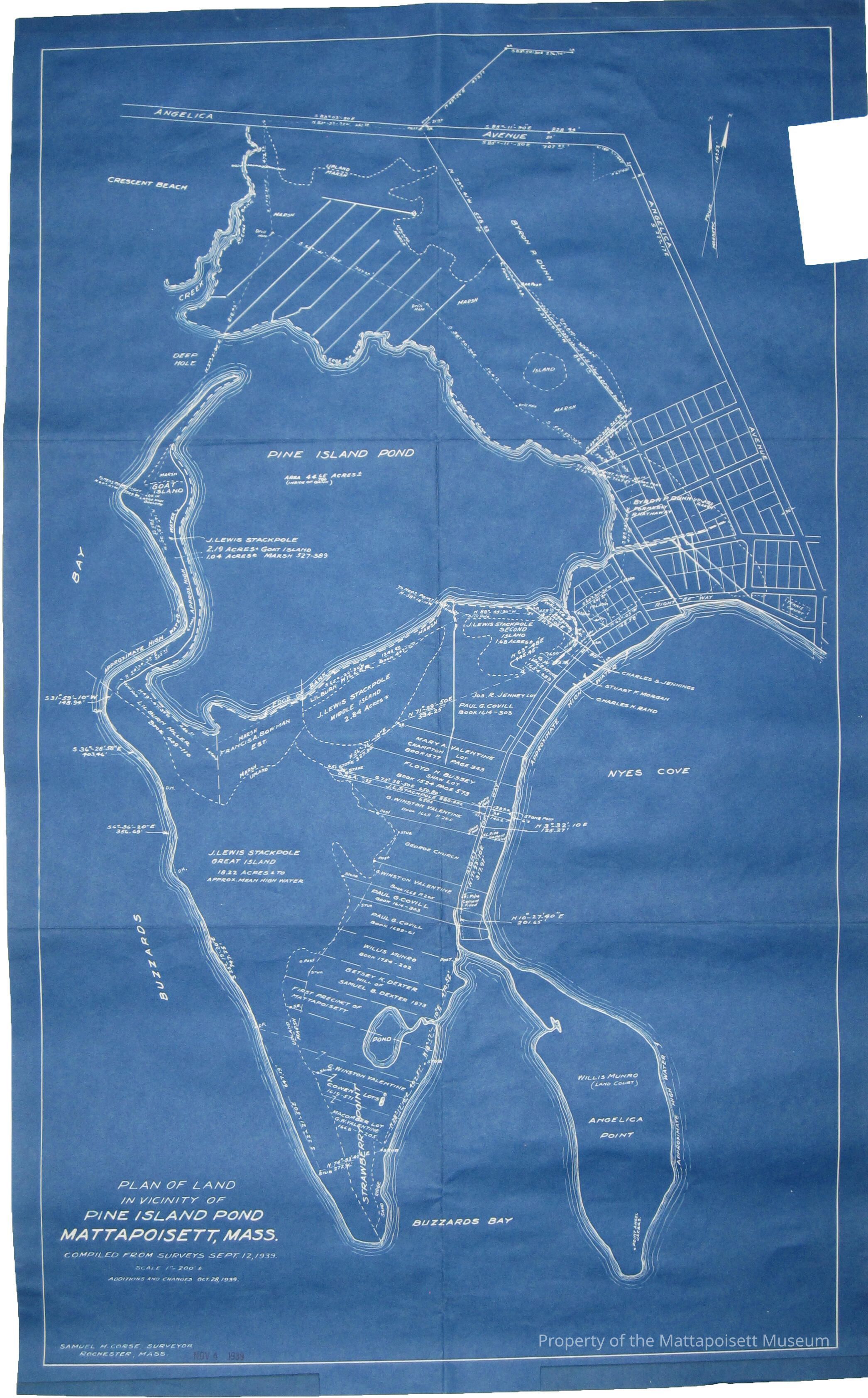 Plan of land in vicinity of Pine Island Pond, Mattapoisett, Mass. Compiled from surveys September 12, 1939. Scale 1"=200'. Additions and changes October 28, 1939. Samuel H. Course, Surveyor, Rochester, Mass, November 4, 1939. Pine Island Pond, Nyes Cove, Buzzard's Bay, Crescent Beach, Angelica AvenueCollection