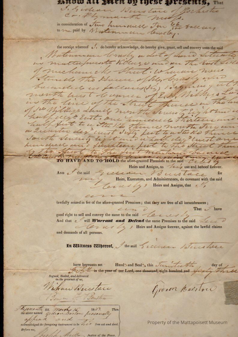 Gideon Barstow to Waterman Crosby, land in Mattapoisett Village, east of Mechanic Street for $210.66.Collection