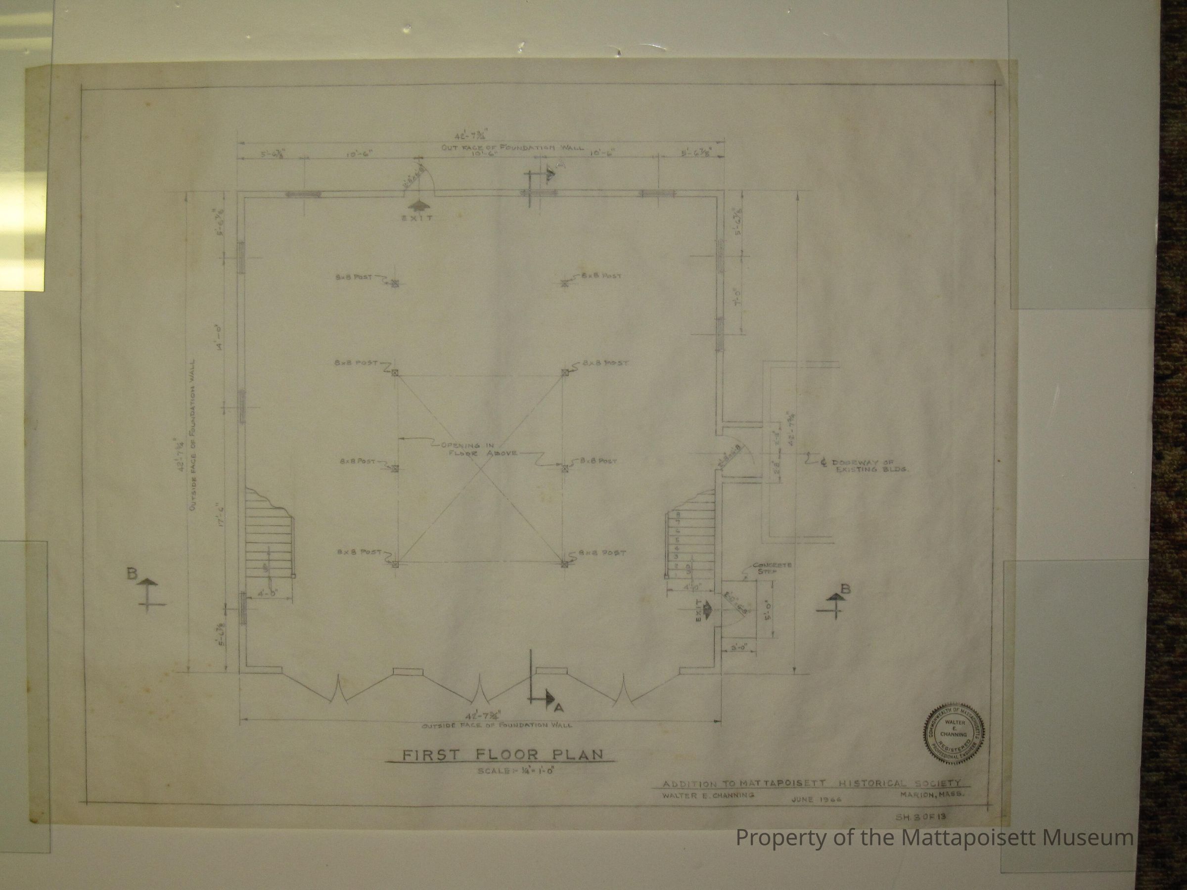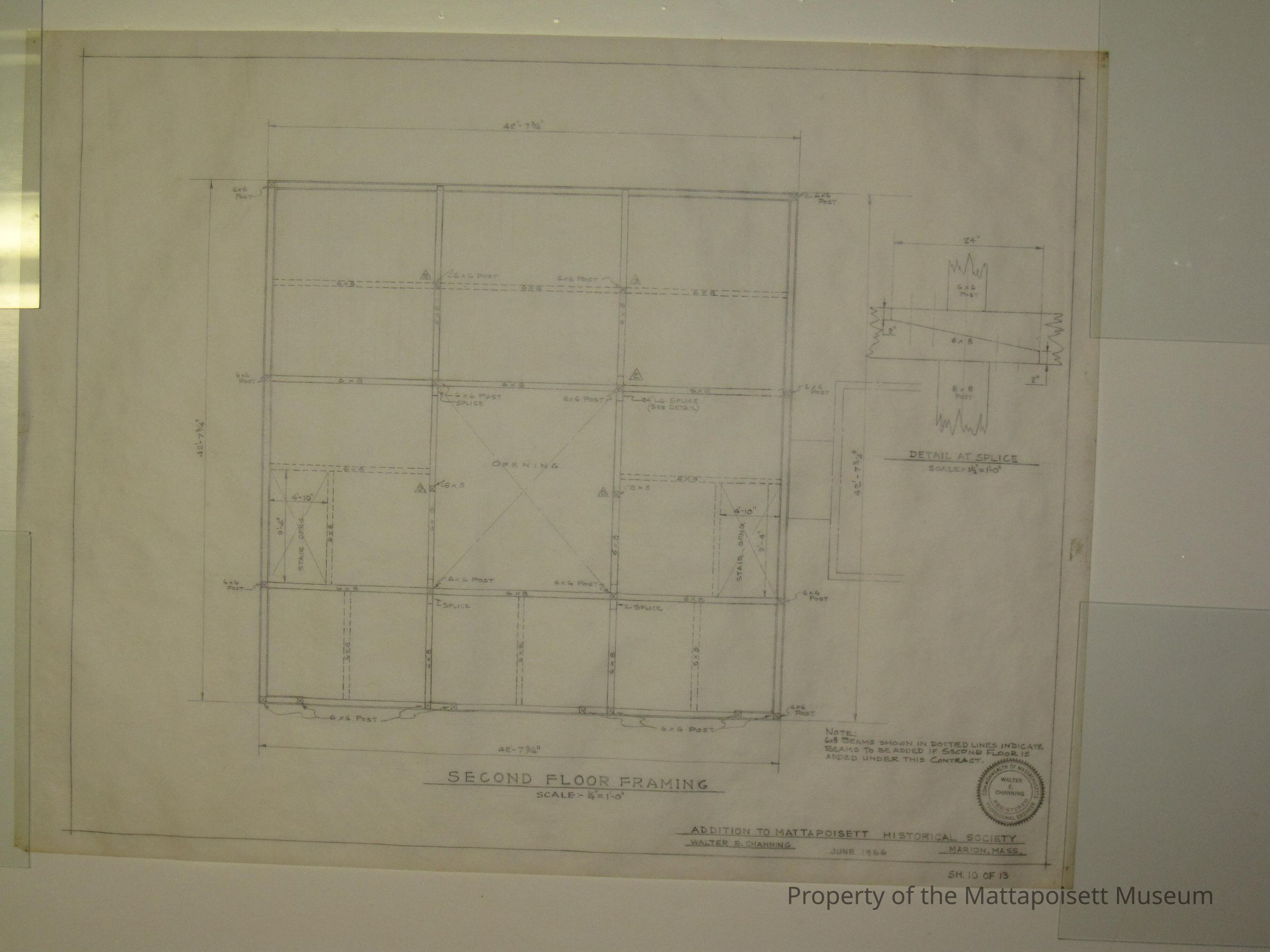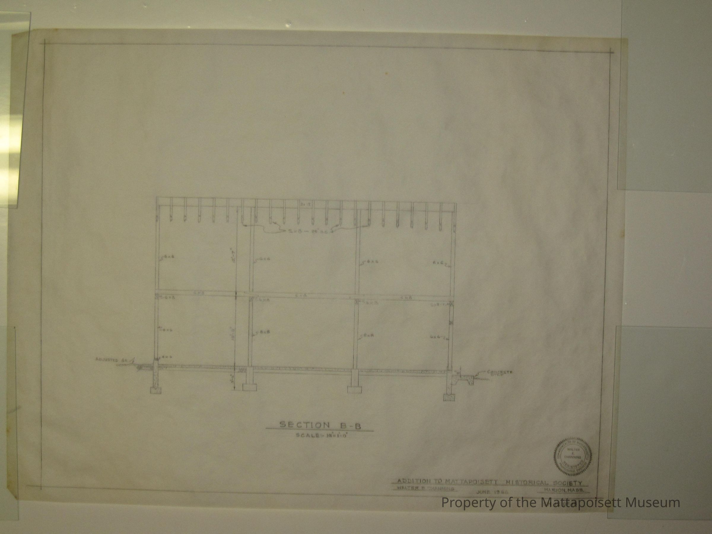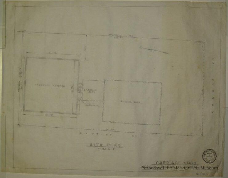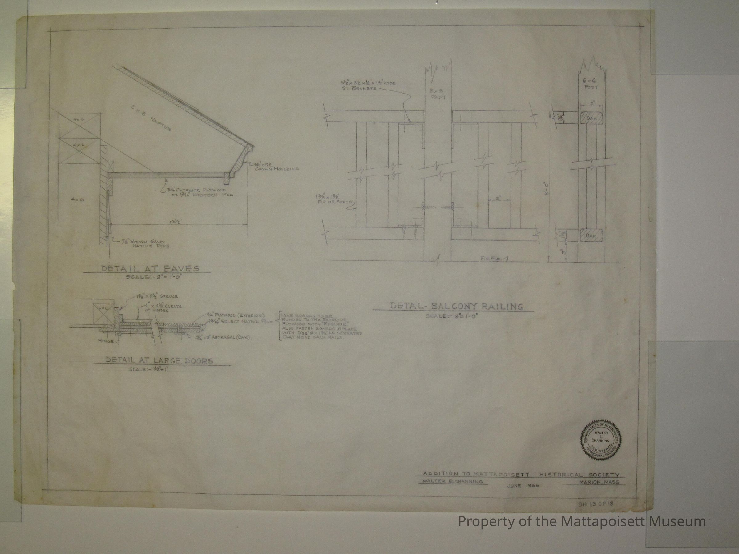 13 plan pages of carriage shed addition to Mattapoisett Historical Society by Walter E. Channing. June 1966.Collection