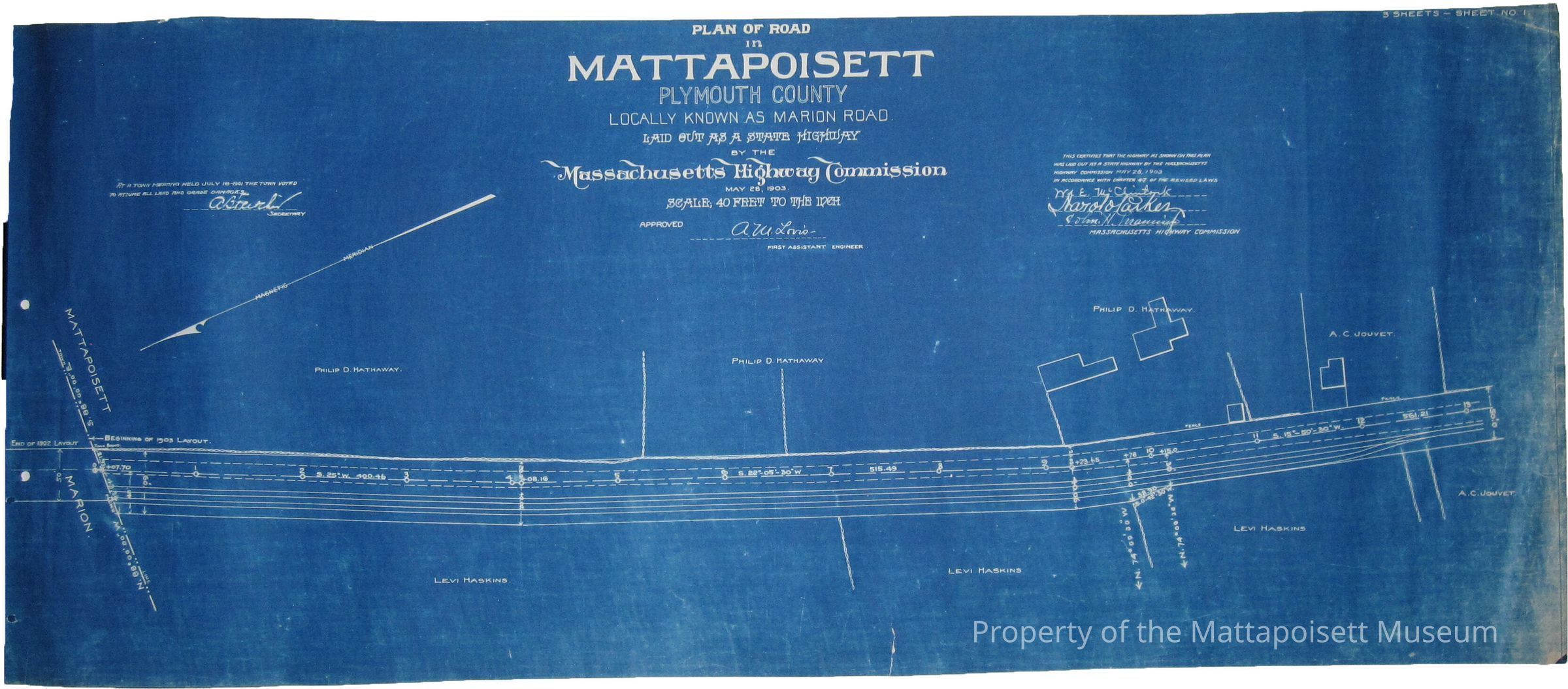 Plan of road in Mattapoisett, Plymouth County, locally known as Marion Road. Laid out as a state highway by the Massachusetts Highway Commission, May 28, 1903. Scale 40 feet to the inch. 3 sheets. 1 copy of each. Additional copy/set found 2016.Acquisition