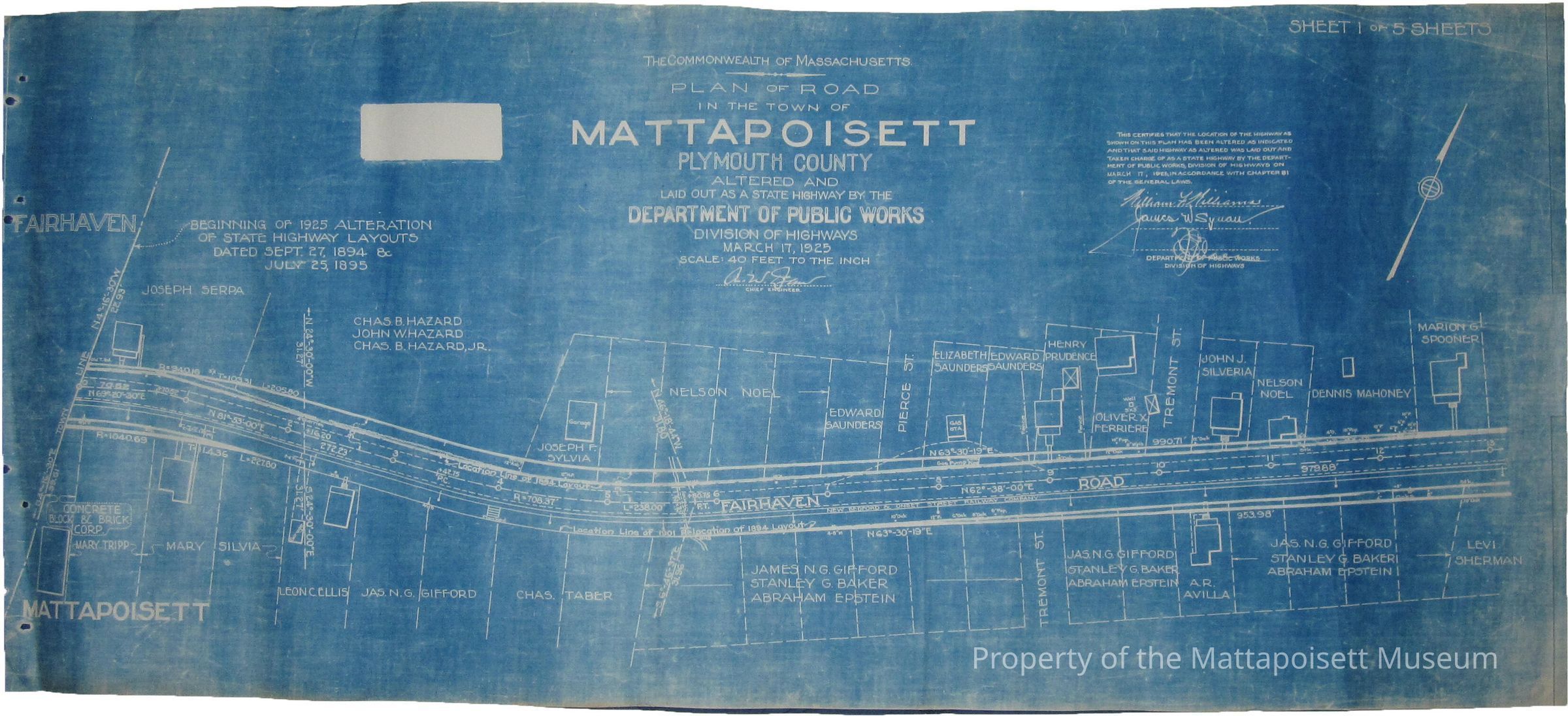 Plan of road in the town of Mattapoisett, Plymouth County, altered and laid out as a state highway by the Department of Public Works, Division of Highways, March 17, 1925. Scale 40 feet to the inch. Should be 5 sheets. Only 1 copy of page 1. Full set, five attached sheets, found, 2016.Acquisition