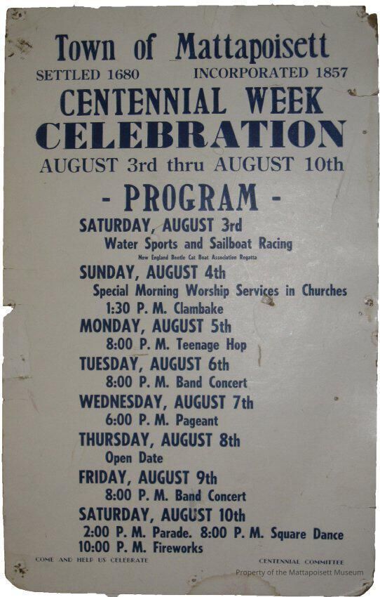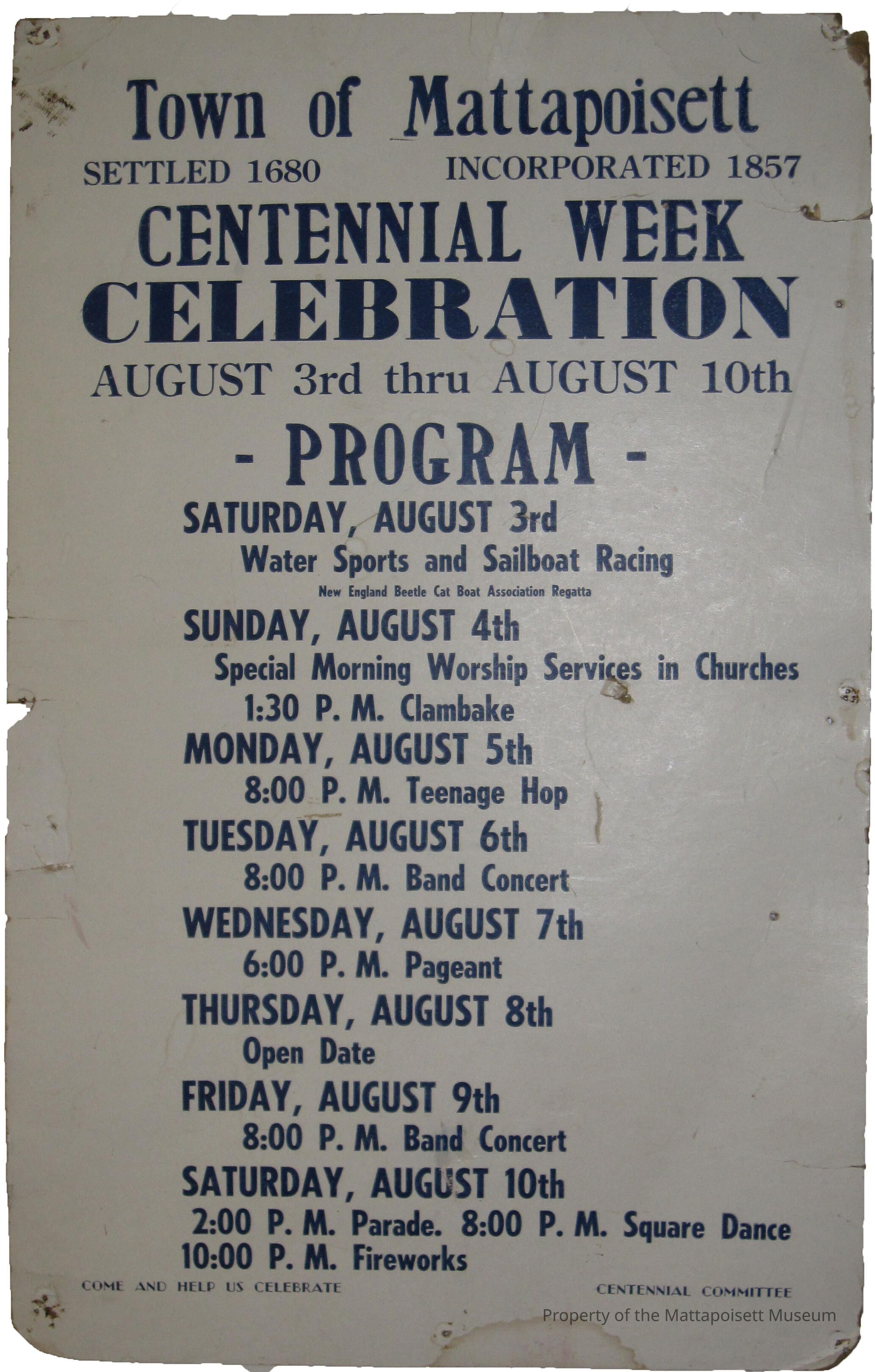 Town of Mattapoisett, settled 1680, incorporated 1857. Centennial Week Celebration, August 3rd through August 10th. Program: Saturday, August 3, Water Sports and Sailboat Racing; New England Beetle Cat Boat Association Regatta. Sunday, August 4, Special Morning Worship Services in Churches; 1:30 pm, Clambake. Monday, August 5th, 8:00 pm Teenage Hop. Tuesday, August 6th, 8:00 pm Band Concert. Wednesday, August 7th, 6:00 pm Pageant. Thursday, August 8th, Open Date. Friday, August 9th, 8:00 pm Band Concert. Saturday, August 10th, 2:00 pm Parade, 8:00 pm Square Dance, 10:00 pm Fireworks. Come and Help us Celebrate. Centennial Committee.Collection