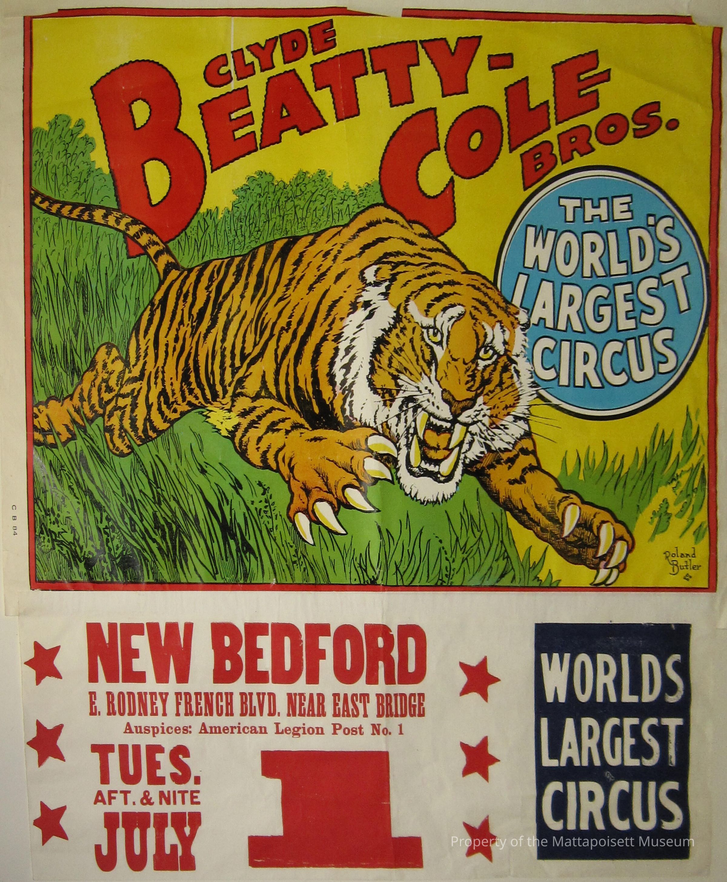 Clyde Beatty-Cole Bros. poster. The World's largest circus. New Bedford, E. Rodney French Blvd, Near East Bridge. Auspices: American Legion Post No. 1. Tues. Aft. & Nite July 1. World's largest circus.Collection