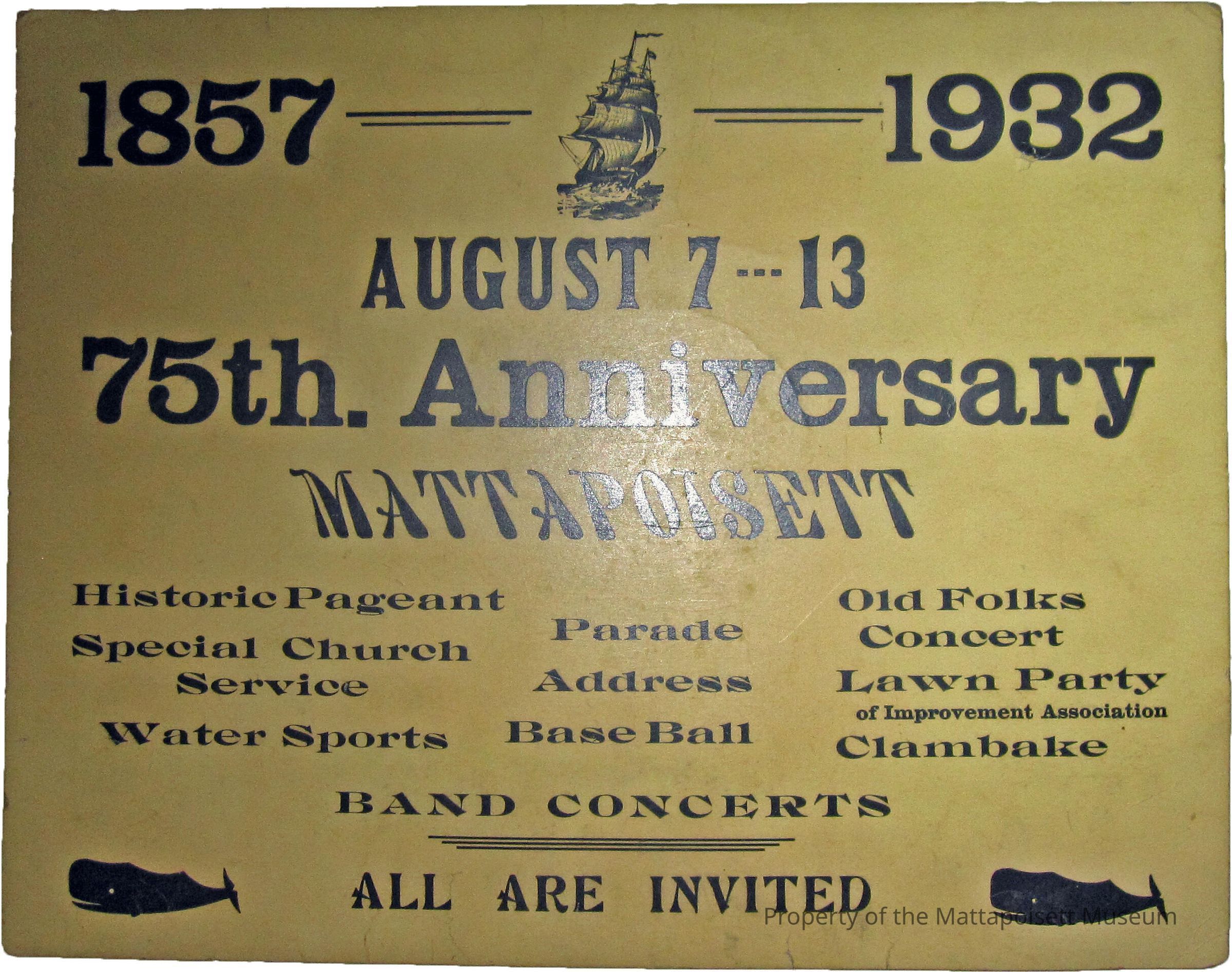 75th Anniversary of Mattapoisett. 1857-1932, August 7-13, 1932. Historical Pageant, Special Church Sercive, Water Sports, Parade, Address, BaseBall, Old Folks’ Concert, Lawn Party (of Improvement Association), Clambake. Band Concerts. All Are Invited.Collection
